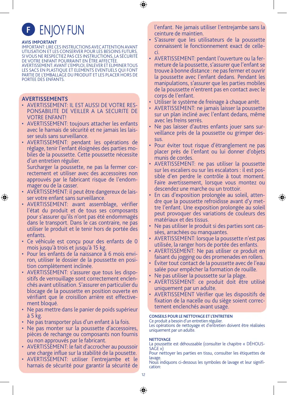 - AVERTISSEMENT: pendant les opérations de réglage, tenir l’enfant éloignées des parties mobiles de la poussette. Cette poussette nécessite d’un entretien régulier. Surcharger la poussette, ne pas la fermer correctement et utiliser avec des accessoires non approuvés par le fabricant risque de l’endommager ou de la casser.
