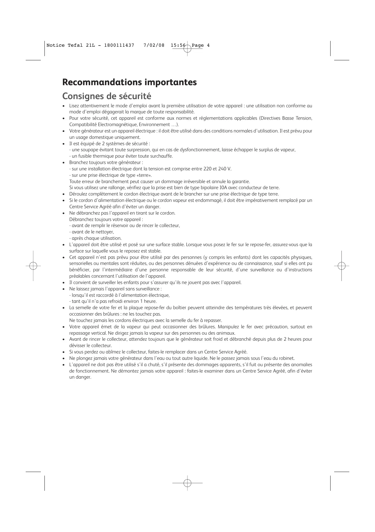 Recommandations importantes Consignes de sécurité • Lisez attentivement le mode d’emploi avant la première utilisation de votre appareil : une utilisation non conforme au mode d’emploi dégagerait la marque de toute responsabilité. • Pour votre sécurité, cet appareil est conforme aux normes et réglementations applicables (Directives Basse Tension, Compatibilité Electromagnétique, Environnement …). • Votre générateur est un appareil électrique : il doit être utilisé dans des conditions normales d’utilisation. Il est prévu pour un usage domestique uniquement. • Il est équipé de 2 systèmes de sécurité : - une soupape évitant toute surpression, qui en cas de dysfonctionnement, laisse échapper le surplus de vapeur, - un fusible thermique pour éviter toute surchauffe. • Branchez toujours votre générateur : - sur une installation électrique dont la tension est comprise entre 220 et 240 V. - sur une prise électrique de type «terre». Toute erreur de branchement peut causer un dommage irréversible et annule la garantie. Si vous utilisez une rallonge, vérifiez que la prise est bien de type bipolaire I0A avec conducteur de terre. • Déroulez complètement le cordon électrique avant de le brancher sur une prise électrique de type terre. • Si le cordon d’alimentation électrique ou le cordon vapeur est endommagé, il doit être impérativement remplacé par un Centre Service Agréé afin d’éviter un danger. • Ne débranchez pas l’appareil en tirant sur le cordon. Débranchez toujours votre appareil : - avant de remplir le réservoir ou de rincer le collecteur, - avant de le nettoyer, - après chaque utilisation. • L’appareil doit être utilisé et posé sur une surface stable. Lorsque vous posez le fer sur le repose-fer, assurez-vous que la surface sur laquelle vous le reposez est stable. • Cet appareil n’est pas prévu pour être utilisé par des personnes (y compris les enfants) dont les capacités physiques, sensorielles ou mentales sont réduites, ou des personnes dénuées d’expérience ou de connaissance, sauf si elles ont pu bénéficier, par l’intermédiaire d’une personne responsable de leur sécurité, d’une surveillance ou d’instructions préalables concernant l’utilisation de l’appareil. • Il convient de surveiller les enfants pour s’assurer qu’ils ne jouent pas avec l’appareil. • Ne laissez jamais l’appareil sans surveillance : - lorsqu’il est raccordé à l’alimentation électrique, - tant qu’il n’a pas refroidi environ 1 heure. • La semelle de votre fer et la plaque repose-fer du boîtier peuvent atteindre des températures très élevées, et peuvent occasionner des brûlures : ne les touchez pas. Ne touchez jamais les cordons électriques avec la semelle du fer à repasser. • Votre appareil émet de la vapeur qui peut occasionner des brûlures. Manipulez le fer avec précaution, surtout en repassage vertical. Ne dirigez jamais la vapeur sur des personnes ou des animaux. • Avant de rincer le collecteur, attendez toujours que le générateur soit froid et débranché depuis plus de 2 heures pour dévisser le collecteur. • Si vous perdez ou abîmez le collecteur, faites-le remplacer dans un Centre Service Agréé. • Ne plongez jamais votre générateur dans l’eau ou tout autre liquide. Ne le passez jamais sous l’eau du robinet. • L’appareil ne doit pas être utilisé s’il a chuté, s’il présente des dommages apparents, s’il fuit ou présente des anomalies de fonctionnement. Ne démontez jamais votre appareil : faites-le examiner dans un Centre Service Agréé, afin d’éviter un danger.