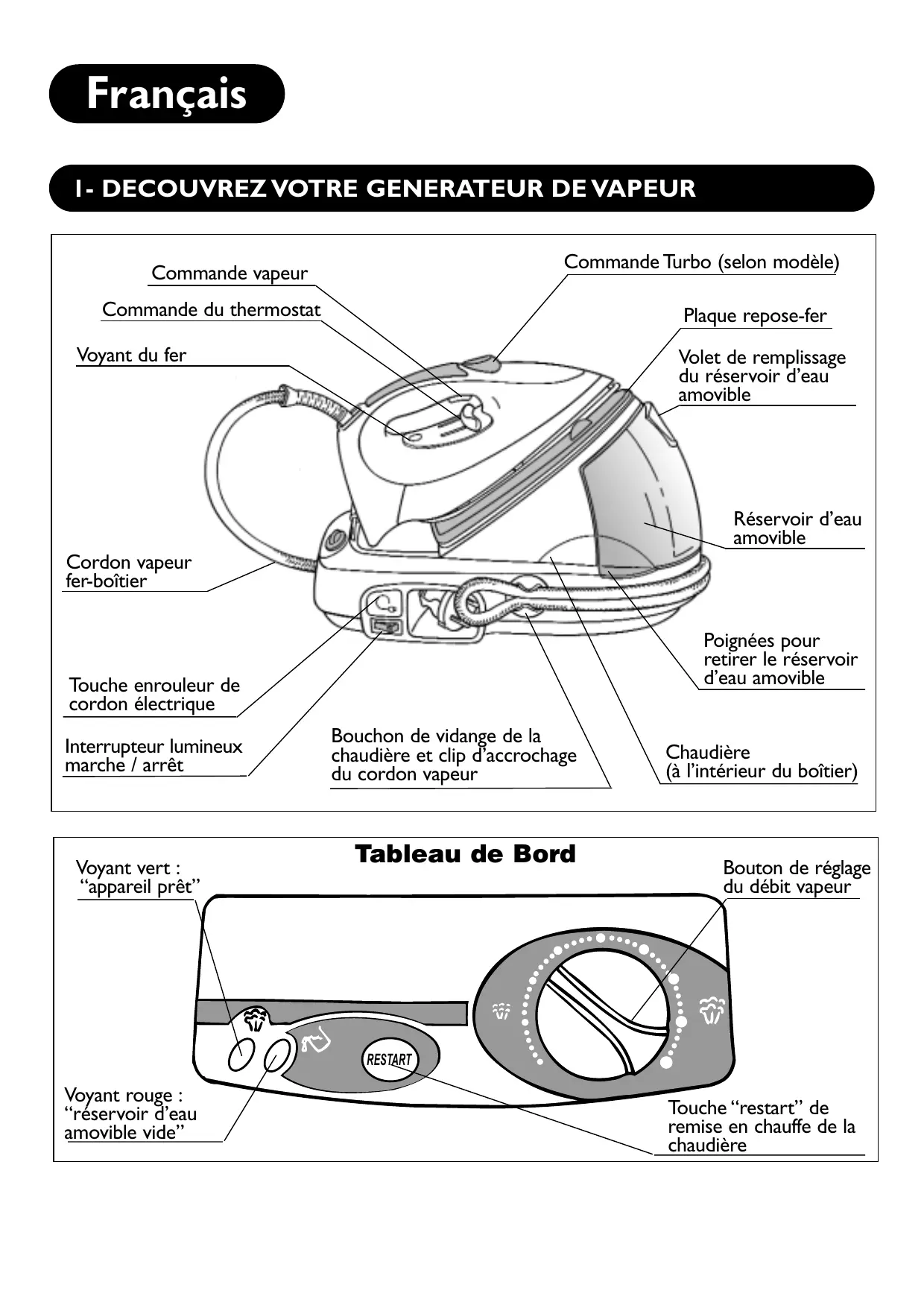Commande Turbo (selon modèle) Commande vapeur Commande du thermostat Plaque repose-fer Voyant du fer Volet de remplissage du réservoir d’eau amovible Réservoir d’eau amovible Cordon vapeur fer-boîtier Poignées pour retirer le réservoir d’eau amovible Touche enrouleur de cordon électrique Interrupteur lumineux marche / arrêt Voyant vert : “appareil prêt” Bouchon de vidange de la chaudière et clip d’accrochage du cordon vapeur Tableau de Bord Chaudière (à l’intérieur du boîtier) Bouton de réglage du débit vapeur RESTART Voyant rouge : “réservoir d’eau amovible vide” Touche “restart” de remise en chauffe de la chaudière