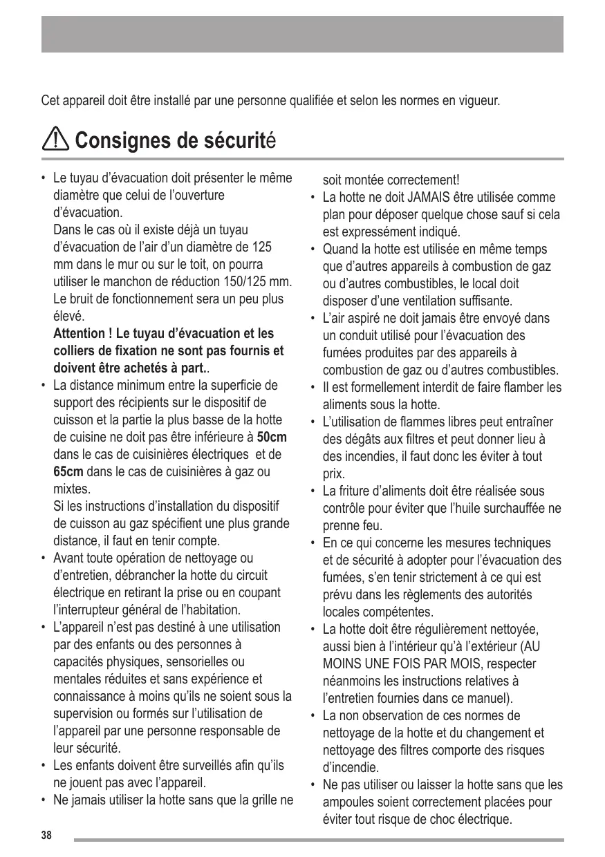 Le bruit de fonctionnement sera un peu plus élevé. Attention ! Le tuyau d’évacuation et les colliers de fixation ne sont pas fournis et doivent être achetés à part.. • La distance minimum entre la superficie de support des récipients sur le dispositif de cuisson et la partie la plus basse de la hotte de cuisine ne doit pas être inférieure à 50cm dans le cas de cuisinières électriques et de 65cm dans le cas de cuisinières à gaz ou mixtes. Si les instructions d’installation du dispositif de cuisson au gaz spécifient une plus grande distance, il faut en tenir compte. • Avant toute opération de nettoyage ou d’entretien, débrancher la hotte du circuit électrique en retirant la prise ou en coupant l’interrupteur général de l’habitation. • L’appareil n’est pas destiné à une utilisation par des enfants ou des personnes à capacités physiques, sensorielles ou mentales réduites et sans expérience et connaissance à moins qu’ils ne soient sous la supervision ou formés sur l’utilisation de l’appareil par une personne responsable de leur sécurité. • Les enfants doivent être surveillés afin qu’ils ne jouent pas avec l’appareil. • Ne jamais utiliser la hotte sans que la grille ne 38
