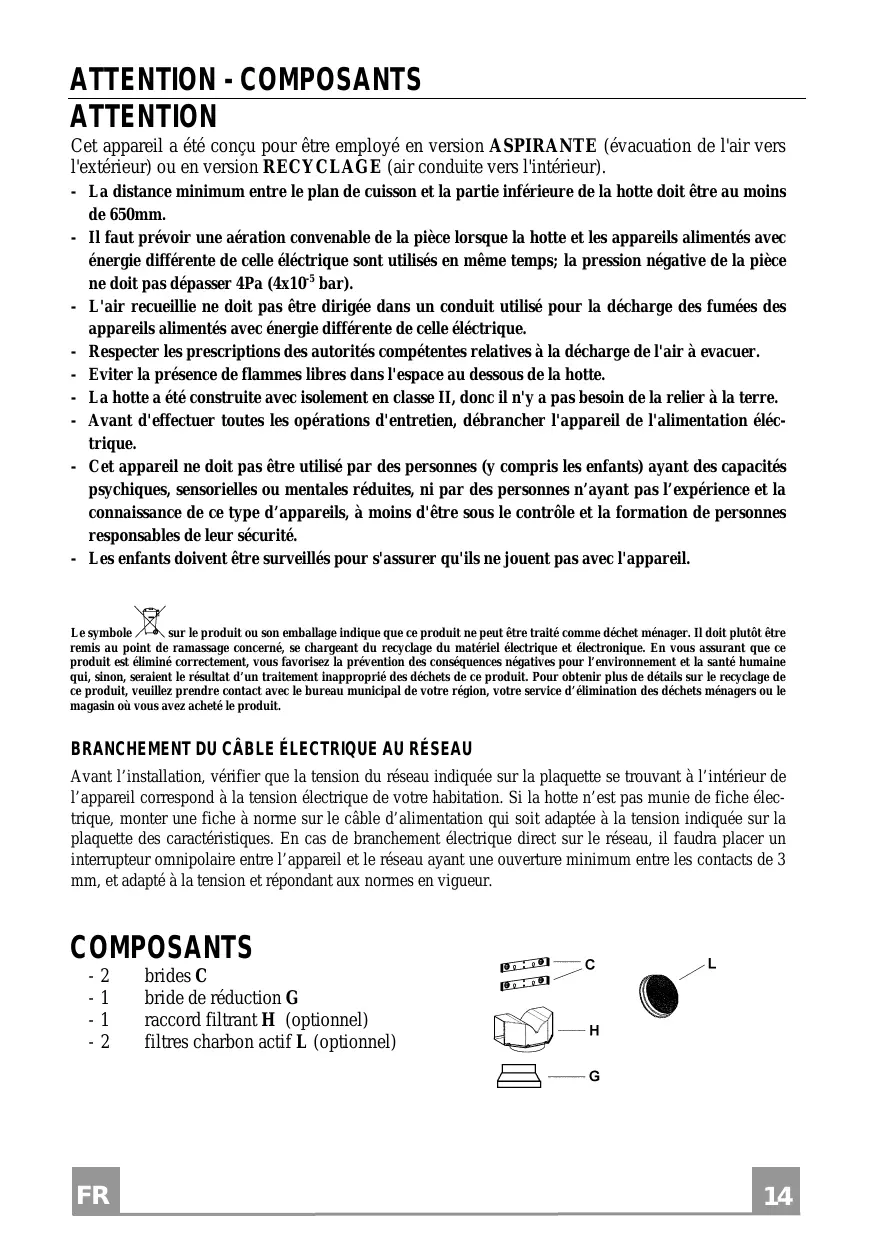 BRANCHEMENT DU CÂBLE ÉLECTRIQUE AU RÉSEAU Avant l’installation, vérifier que la tension du réseau indiquée sur la plaquette se trouvant à l’intérieur de l’appareil correspond à la tension électrique de votre habitation. Si la hotte n’est pas munie de fiche électrique, monter une fiche à norme sur le câble d’alimentation qui soit adaptée à la tension indiquée sur la plaquette des caractéristiques. En cas de branchement électrique direct sur le réseau, il faudra placer un interrupteur omnipolaire entre l’appareil et le réseau ayant une ouverture minimum entre les contacts de 3 mm, et adapté à la tension et répondant aux normes en vigueur.