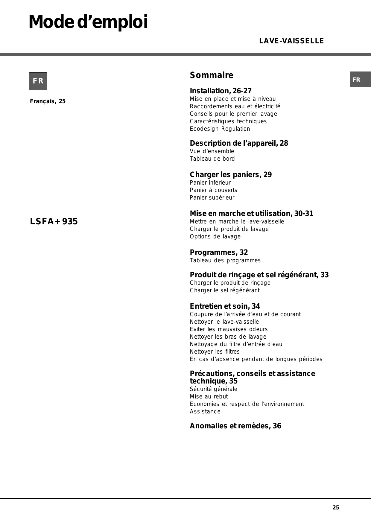LSFA 935 EU/HA - Lave-vaisselle HOTPOINT - Notice d'utilisation et mode d'emploi gratuit