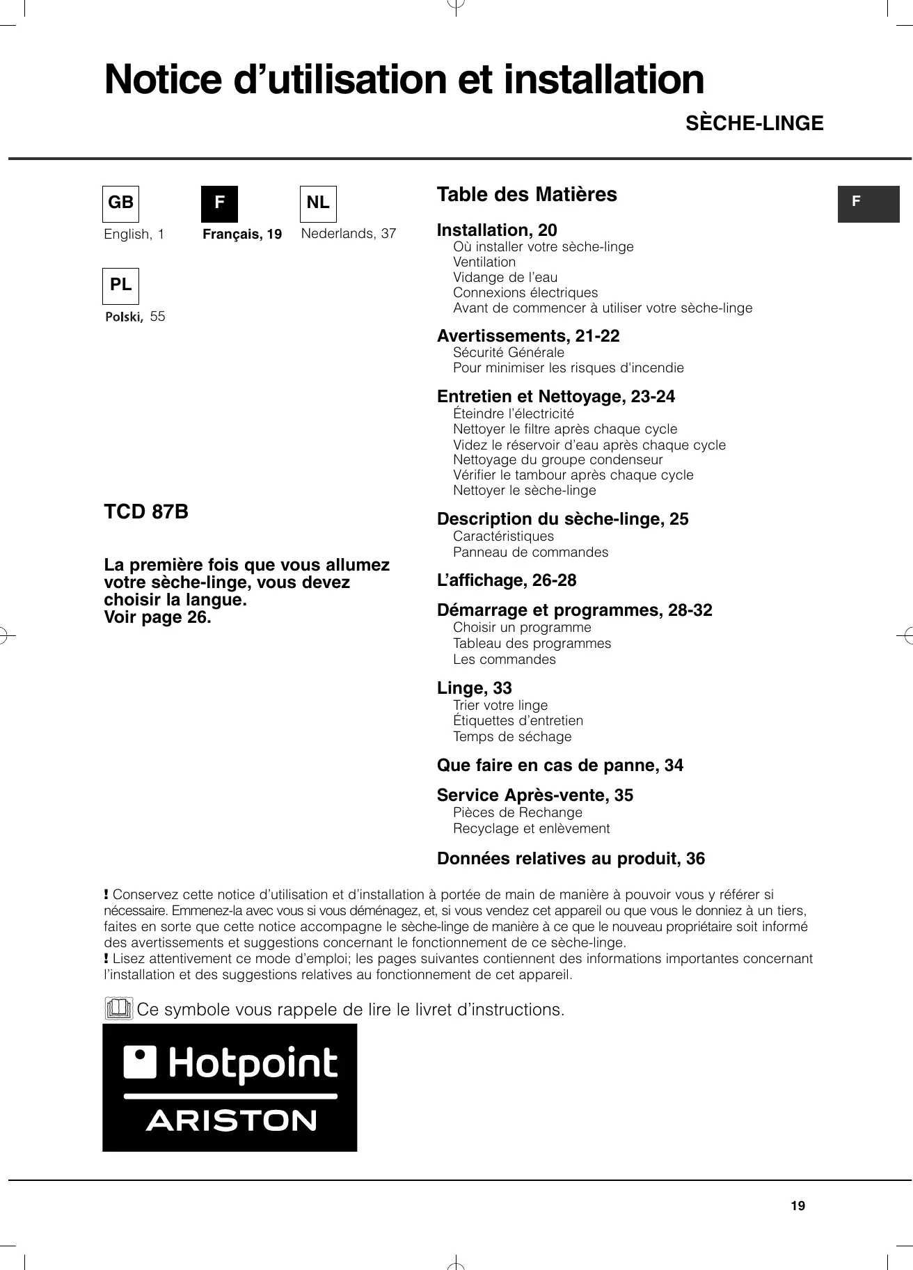 MODE D'EMPLOI TCD 87 B 6K HOTPOINT