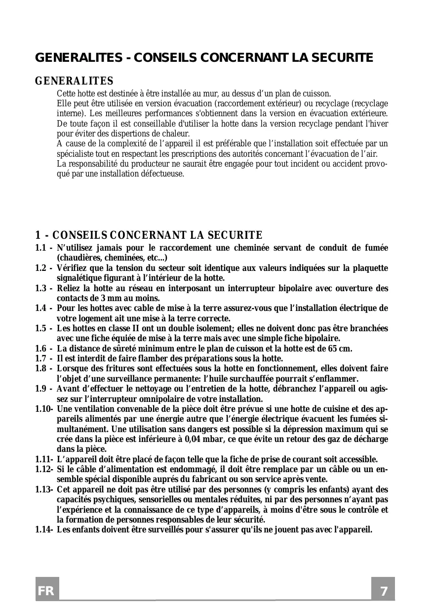 1.1 - N’utilisez jamais pour le raccordement une cheminée servant de conduit de fumée (chaudières, cheminées, etc...) 1.2 - Vérifiez que la tension du secteur soit identique aux valeurs indiquées sur la plaquette signalétique figurant à l’intérieur de la hotte. 1.3 - Reliez la hotte au réseau en interposant un interrupteur bipolaire avec ouverture des contacts de 3 mm au moins. 1.4 - Pour les hottes avec cable de mise à la terre assurez-vous que l’installation électrique de votre logement ait une mise à la terre correcte. 1.5 - Les hottes en classe II ont un double isolement; elles ne doivent donc pas être branchées avec une fiche équiée de mise à la terre mais avec une simple fiche bipolaire. 1.6 - La distance de sûreté minimum entre le plan de cuisson et la hotte est de 65 cm. 1.7 - Il est interdit de faire flamber des préparations sous la hotte. 1.8 - Lorsque des fritures sont effectuées sous la hotte en fonctionnement, elles doivent faire l’objet d’une surveillance permanente: l’huile surchauffée pourrait s’enflammer. 1.9 - Avant d’effectuer le nettoyage ou l’entretien de la hotte, débranchez l’appareil ou agissez sur l’interrupteur omnipolaire de votre installation. 1.10- Une ventilation convenable de la pièce doit être prévue si une hotte de cuisine et des appareils alimentés par une énergie autre que l’énergie électrique évacuent les fumées simultanément. Une utilisation sans dangers est possible si la dépression maximum qui se crée dans la pièce est inférieure à 0,04 mbar, ce que évite un retour des gaz de décharge dans la pièce. 1.11- L’appareil doit être placé de façon telle que la fiche de prise de courant soit accessible. 1.12- Si le câble d’alimentation est endommagé, il doit être remplace par un câble ou un ensemble spécial disponible auprés du fabricant ou son service après vente. 1.13- Cet appareil ne doit pas être utilisé par des personnes (y compris les enfants) ayant des capacités psychiques, sensorielles ou mentales réduites, ni par des personnes n’ayant pas l’expérience et la connaissance de ce type d’appareils, à moins d'être sous le contrôle et la formation de personnes responsables de leur sécurité. 1.14- Les enfants doivent être surveillés pour s'assurer qu'ils ne jouent pas avec l'appareil.
