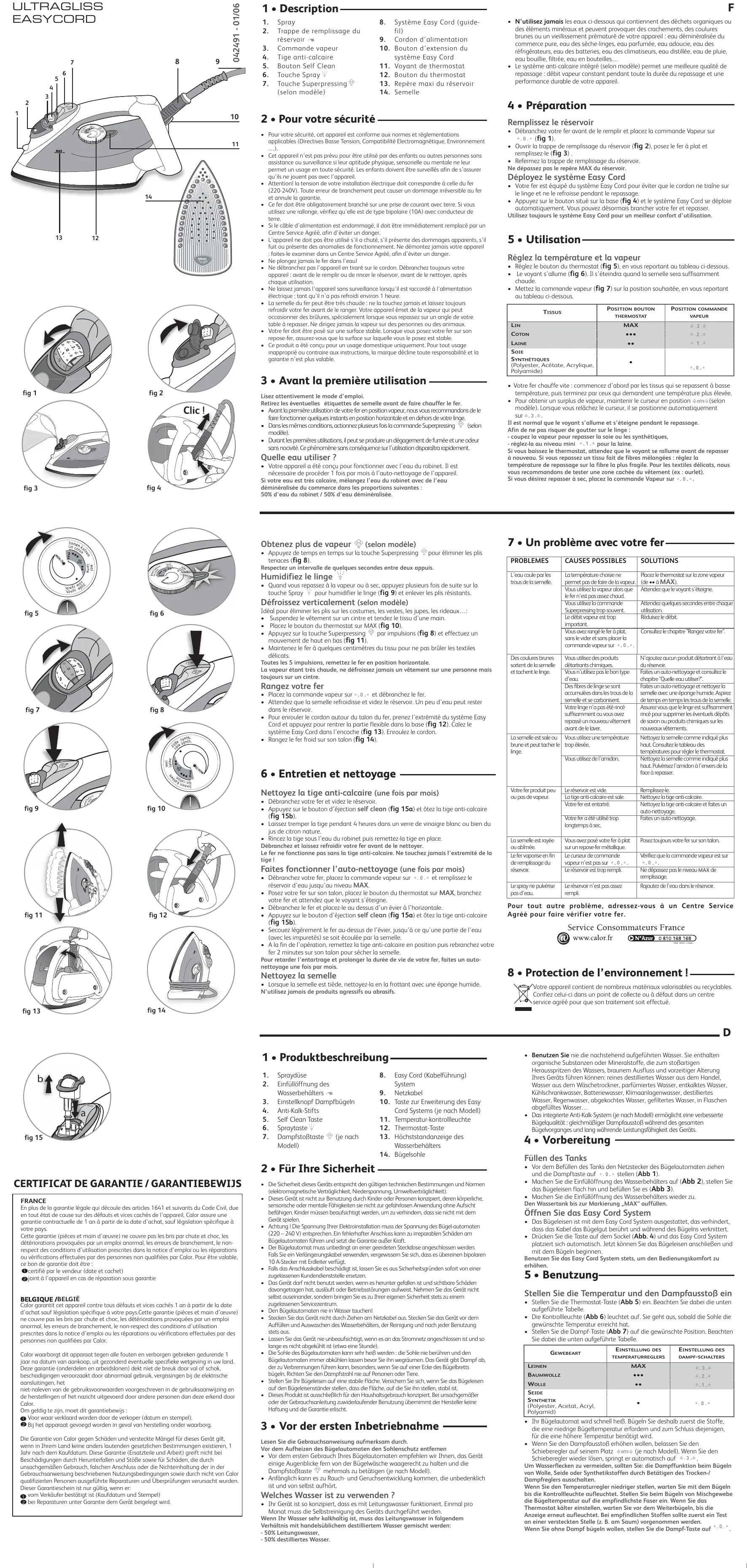 FRANCE Des Centres-Service Agréés par Calor assurent notre service après-vente. Ils sont à votre disposition pour toute intervention sur nos produits sous garantie et hors garantie, la vente de nos accessoires et pièces détachées. Pour connaître la liste de ces CentresService ou pour tout autre renseignement, vous pouvez nous contacter : Service Consommateurs : CALOR S.A. BP 15 69131 ECULLY Cedex Internet : www. calor. fr Si vous ne pouvez pas acquérir les accessoires dont vous avez besoin dans votre point de vente habituel, vous pouvez, depuis la France, passer commande par minitel. BELGIQUE / BELGIË Des Centres-Service Agréés par CALOR assurent notre service après-vente. Ils sont à votre disposition pour toute intervention sur nos produits sous garantie et hors garantie, la vente de nos accessoires et pièces détachées. Pour connaître la liste de ces Centres- Service ou pour tout autre renseignement, vous pouvez nous contacter : CALOR beschikt, naast onze eigen consumentenservice (zie onderstaand adres), over regionale erkende service-centra die u een goede service garanderen. Zij staan tot uw beschikking voor elke vorm van service, zowel binnen als buiten de garantieperiode van het apparaat. Tevens kunt u bij deze service-centra terecht voor accessoires en onderdelen van onze producten. Om de lijst met service-adressen te ontvangen of voor elke andere informatie, kunt u rechtstreeks contact met ons opnemen : Für unseren Kundendienst sind die von CALOR zugelassenen Servicezentren zuständig. Sie übernehmen Reparaturen aller Art an unseren Produkten, die unter Garantie stehen sowie an solchen, deren Garantie abgelaufen ist und vertreiben unsere Zubehör- und Ersatzteile. Die Liste dieser Servicezentren sowie sonstige Auskünfte erhalten Sie beim: Service Consommateurs / Consumentenservice / Verbraucherdienst : BELGIË