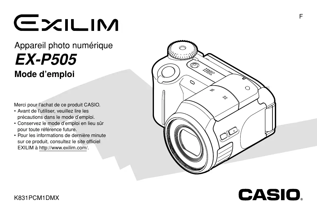ŒXILIN Appareil photo numérique EX-P505 Mode d'emploi Merci pour l'achat de ce produit CASIO. + Avant de l'utiliser, veuillez lire les précautions dans le mode d'emploi. + Conservez le mode d'emploi en lieu sûr pour toute référence future. + Pour les informations de dernière minute sur ce produit, consultez le site officiel EXILIM à http//www.exilim.com.
