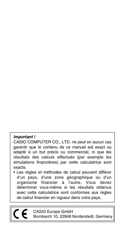 - Les règles et méthodes de calcul peuvent différer d’un pays, d’une zone géographique ou d’un organisme financier à l’autre. Vous devez déterminer vous-même si les résultats obtenus avec cette calculatrice sont conformes aux règles de calcul financier en vigueur dans votre pays. CASIO Europe GmbH Bornbarch 10, 22848 Norderstedt, Germany A propos de ce mode d’emploi