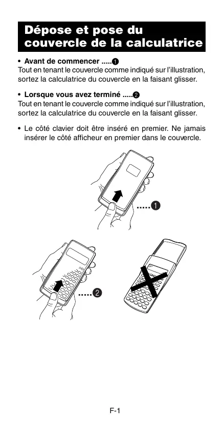 - Avant de commencer .....1 Tout en tenant le couvercle comme indiqué sur l’illustration, sortez la calculatrice du couvercle en la faisant glisser.