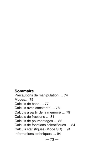 fx-85B/fx-280 DEUTSCH 110 ITALIANO 147 Sommaire Précautions de manipulation … 74 Modes… 75 Calculs de base … 77 Calculs avec constante … 78 Calculs à partir de la mémoire … 79 Calculs de fractions … 81 Calculs de pourcentages … 82 Calculs de fonctions scientifiques … 84 Calculs statistiques (Mode SD)… 91 Informations techniques … 94 — 73 — Précautions de manipulation