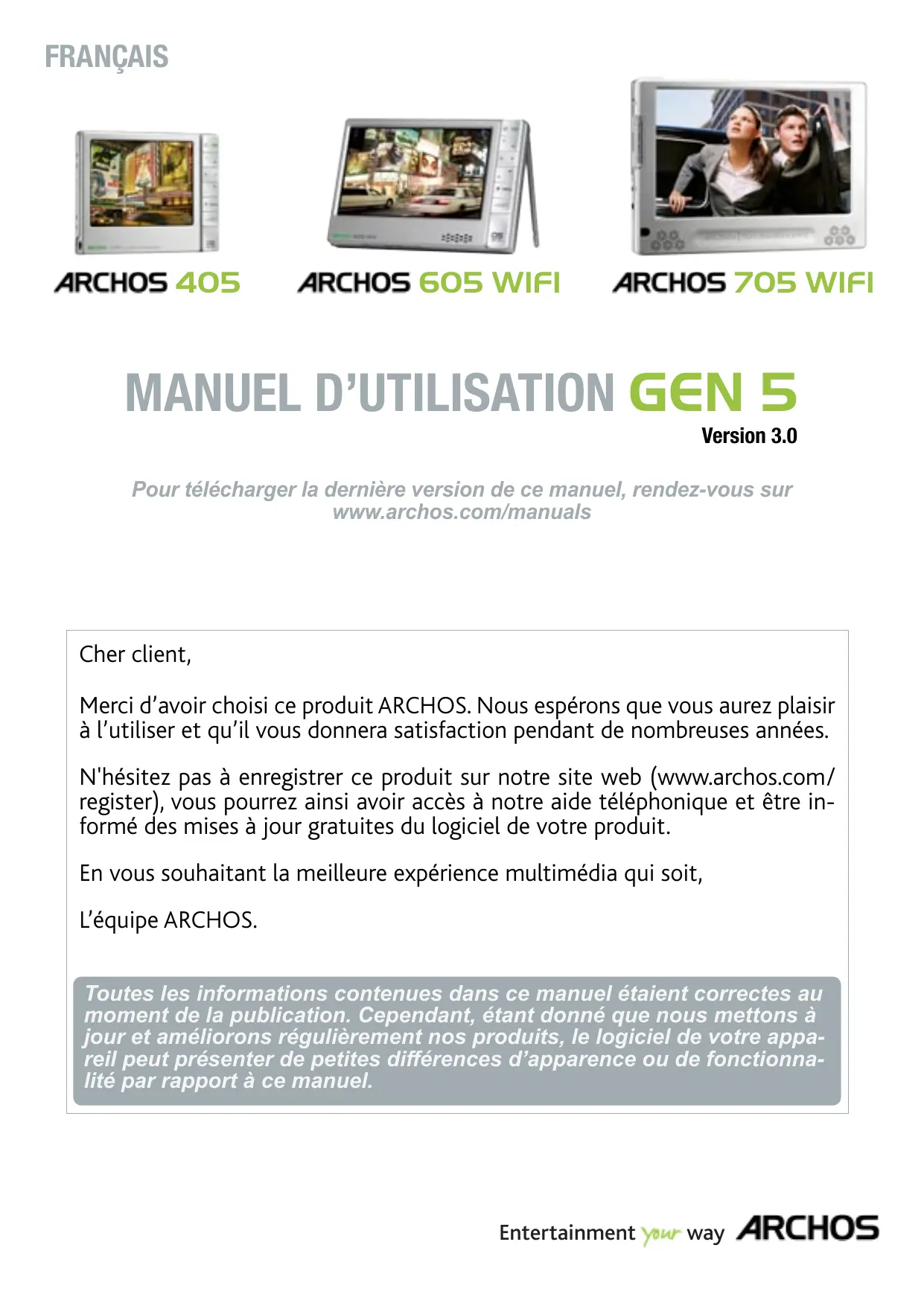 Version 3.0 Pour télécharger la dernière version de ce manuel, rendez-vous sur www.archos.com/manuals Cher client, Merci d’avoir choisi ce produit ARCHOS. Nous espérons que vous aurez plaisir à l'utiliser et qu'il vous donnera satisfaction pendant de nombreuses années. N'hésitez pas à enregistrer ce produit sur notre site web (www.archos.com/ register), vous pourrez ainsi avoir accès à notre aide téléphonique et être in- formé des mises à jour gratuites du logiciel de votre produit. En vous souhaitant la meilleure expérience multimédia qui soit, L'équipe ARCHOS. Toutes les informations contenues dans ce manuel étaient correctes au moment de la publication. Cependant, étant donné que nous mettons à jour et améliorons régulièrement nos produits, le logiciel de votre appa- reil peut présenter de petites différences d'apparence ou de fonctionna- lité par rapport à ce manuel. Entertainment yo way ARCHOS