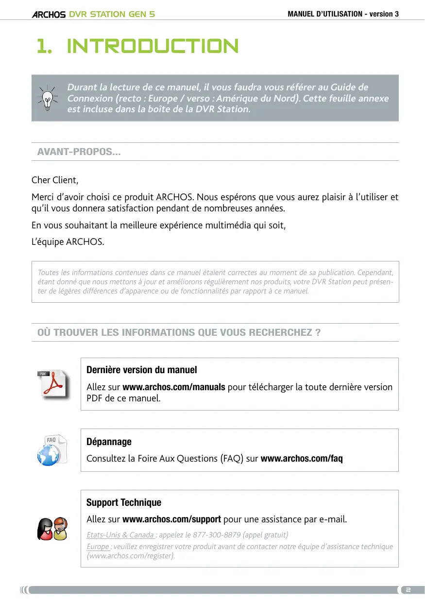 Durant la lecture de ce manuel, il vous faudra vous référer au Guide de Connexion (recto : Europe / verso : Amérique du Nord). Cette feuille annexe est incluse dans la boîte de la DVR Station. avant-propos... Cher Client, Merci d’avoir choisi ce produit Archos. Nous espérons que vous aurez plaisir à l’utiliser et qu’il vous donnera satisfaction pendant de nombreuses années. En vous souhaitant la meilleure expérience multimédia qui soit, L’équipe Archos. Toutes les informations contenues dans ce manuel étaient correctes au moment de sa publication. Cependant, étant donné que nous mettons à jour et améliorons régulièrement nos produits, votre DVR Station peut présenter de légères différences d’apparence ou de fonctionnalités par rapport à ce manuel. où trouver les informations que vous recherchez ? Dernière version du manuel Allez sur www.archos.com/manuals pour télécharger la toute dernière version PDF de ce manuel. Dépannage Consultez la Foire Aux Questions (FAQ) sur www.archos.com/faq Support Technique Allez sur www.archos.com/support pour une assistance par e-mail. Etats-Unis & Canada : appelez le 877-300-8879 (appel gratuit) Europe : veuillez enregistrer votre produit avant de contacter notre équipe d’assistance technique (www.archos.com/register).