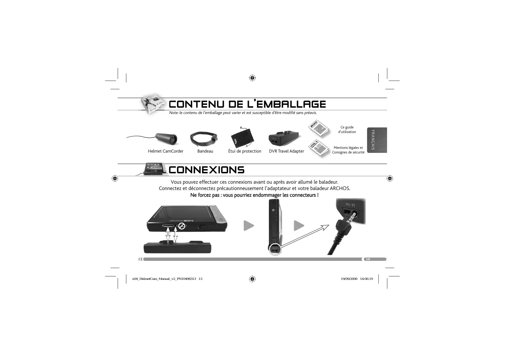 FRANÇAIS Caractéristiques techniques du Helmet CamCorder d’Archos Résolution ................................................................................ 420 lignes TV Capteur...................................................................................... CCD couleur Super HAD SONY de ¼ de pouce Objectif ..................................................................................... focale fixe 3,6 mm Angle de champ ..................................................................... 72,5 degrés Profondeur de champ .......................................................... de 1,5 à 10 mètres Balance des blancs ................................................................ automatique Sensibilité ................................................................................. 1,0 Lux / F 1,2 Alimentation ........................................................................... via l’appareil ARCHOS Résolution d’enregistrement avec l’appareil ARCHOS .... 512 x 384 (optimale) ou 640 x 480 (VGA) Poids ........................................................................................... 100 g environ avec le DVR Travel Adapter Dimensions .............................................................................. 20,5 mm (Ø) x 72 mm (L) Résolution CCD ...................................................................... modèle NTSC en 512 x 492 - modèle PAL en 582 x 500 Température de fonctionnement ..................................... entre 5°C et 35°C environ Configuration requise........................................................... baladeur ARCHOS séries 404, 504 ou 604 Toutes les marques et les noms de produits sont des marques déposées appartenant à leurs propriétaires respectifs. Les spécifications peuvent changer sans préavis. Sauf erreur ou omission. Les images et les illustrations peuvent ne pas toujours correspondre au contenu. Toutes les informations contenues dans ce guide étaient correctes au moment de la publication. COPYRIGHT ARCHOS™ © 2006. Tous droits réservés.