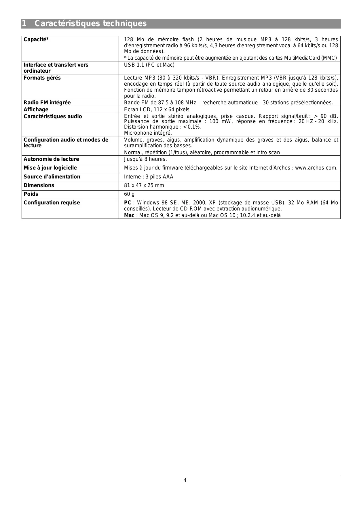 • La capacité de mémoire peut être augmentée en ajoutant des cartes MultiMediaC ard (MMC) Interface et transfert vers USB 1.1 (PC et Mac) ordinateur Formats gérés Lecture MP3 (30 à 320 kbits/s - VBR). Enregistrement MP3 (VBR jusqu'à 128 kbits/s), encodage en temps réel (à partir de toute source audio analogique, quelle qu'elle soit). Fonction de mémoire tampon rétroactive permettant un retour en arrière de 30 secondes pour la radio. Radio FM intégrée Bande FM de 87.5 à 108 MHz - recherche automatique - 30 stations présélectionnées Affichage Ecran LCD, 112 x 64 pixels Caractéristiques audio Entrée et sortie stéréo analogiques, prise casque. Rapport signal/bruit: > 90 dB. Puissance de sortie maximale : 100 mW, réponse en fréquence : 20 HZ -20 kHz. Distorsion harmonique : <0,1% Microphone intégré. Configuration audio et modes de Volume, graves, aigus, amplification dynamique des graves et des aigus, balance et lecture suramplification des basses. Normal, répétition (1/tous), aléatoire, programmable et intro scan Autonomie de lecture Jusqu'à 8 heures Mise à jour logicielle Mises à jour du firmware téléchargeables sur le site Internet d'Archos : www.archos.com. Source d'alimentation Interne : 3 piles AAA Dimensions 81x47 x25 mm Poids 60 g Configuration requise PC : Windows 98 SE, ME, 2000, XP (stockage de masse USB). 32 Mo RAM (64 Mo conseillés). Lecteur de CD-ROM avec extraction audionumérique. Mac : Mac OS 9, 9.2 et au-delà ou Mac OS 10 ; 10.2.4 et au-delà