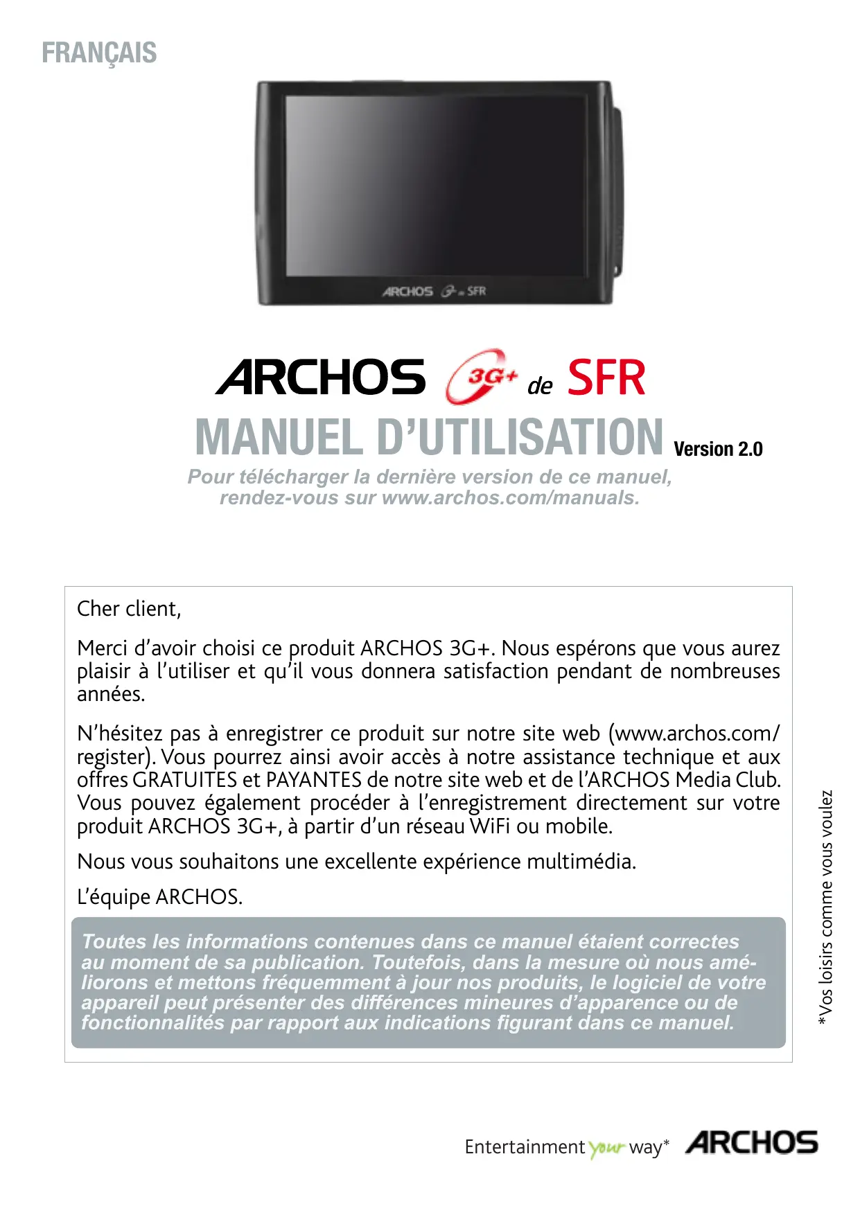 Retrouvez gratuitement la notice de l'appareil 3G+ DE SFR ARCHOS au format PDF.