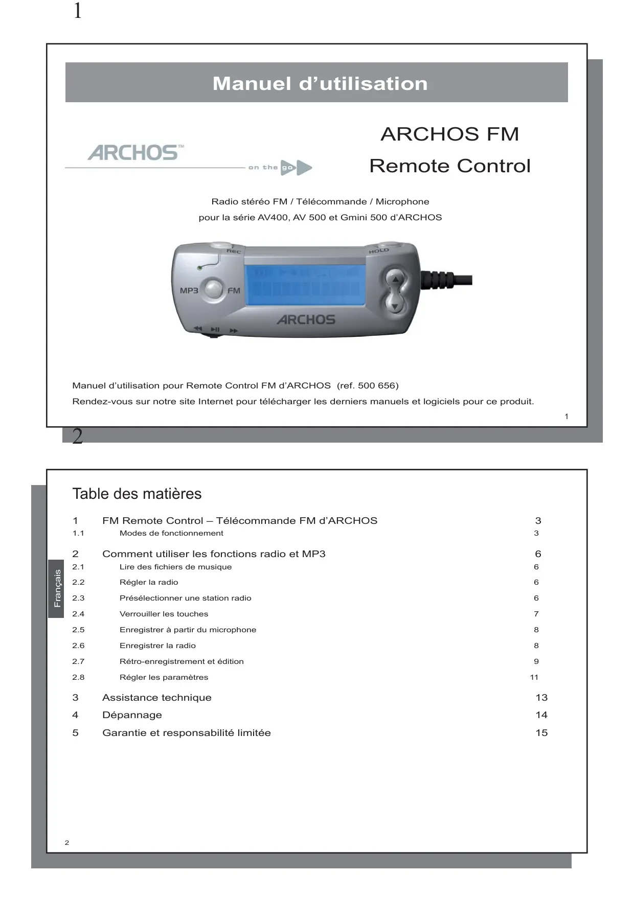 Manuel d’utilisation ARCHOS FM Remote Control Radio stéréo FM / Télécommande / Microphone pour la série AV400, AV 500 et Gmini 500 d’ARCHOS Manuel d’utilisation pour Remote Control FM d’ARCHOS (ref. 500 656) Rendez-vous sur notre site Internet pour télécharger les derniers manuels et logiciels pour ce produit.