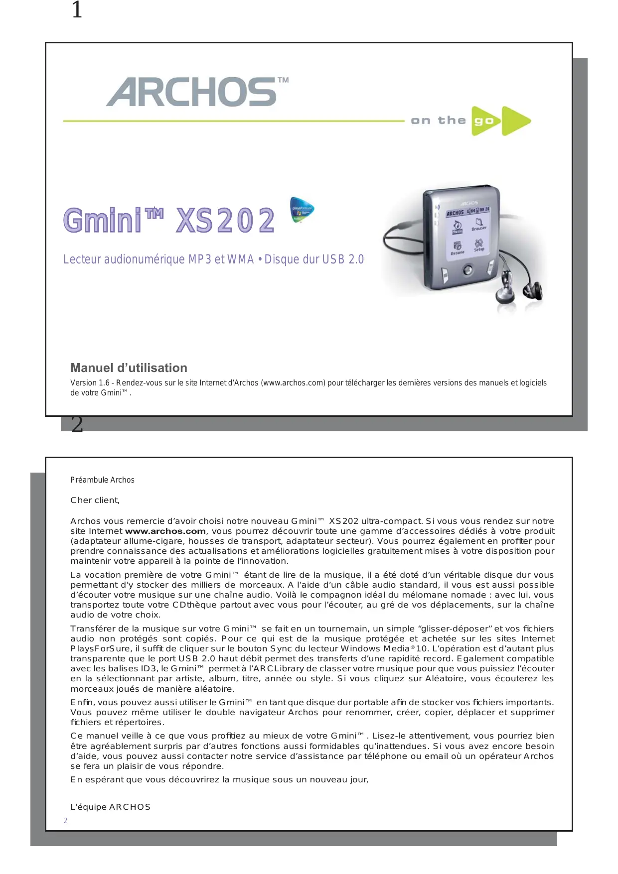 Gmini™ XS202 Lecteur audionumérique MP3 et WMA • Disque dur USB 2.0 Manuel d’utilisation Version 1.6 - Rendez-vous sur le site Internet d’Archos (www.archos.com) pour télécharger les dernières versions des manuels et logiciels de votre Gmini™.