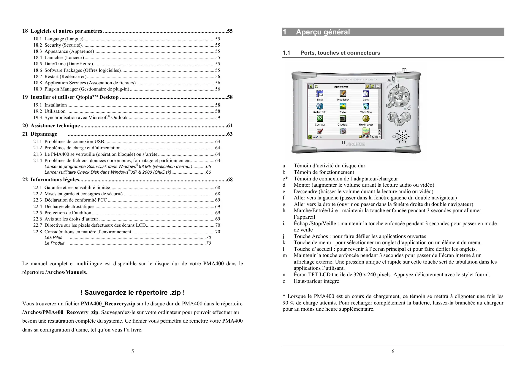 ! Sauvegardez le répertoire .zip ! Vous trouverez un fichier PMA400_Recovery.zip sur le disque dur du PMA400 dans le répertoire /Archos/PMA400_Recovery_zip. Sauvegardez-le sur votre ordinateur pour pouvoir effectuer au Témoin d’activité du disque dur Témoin de fonctionnement Témoin de connexion de l’adaptateur/chargeur Monter (augmenter le volume durant la lecture audio ou vidéo) Descendre (baisser le volume durant la lecture audio ou vidéo) Aller vers la gauche (passer dans la fenêtre gauche du double navigateur) Aller vers la droite (ouvrir ou passer dans la fenêtre droite du double navigateur) Marche/Entrée/Lire : maintenir la touche enfoncée pendant 3 secondes pour allumer l’appareil Échap./Stop/Veille : maintenir la touche enfoncée pendant 3 secondes pour passer en mode de veille Touche Archos : pour faire défiler les applications ouvertes Touche de menu : pour sélectionner un onglet d’application ou un élément du menu Touche d’accueil : pour revenir à l’écran principal et pour faire défiler les onglets. Maintenir la touche enfoncée pendant 3 secondes pour passer de l’écran interne à un affichage externe. Une pression unique et rapide sur cette touche sert de tabulation dans les applications l’utilisant. Écran TFT LCD tactile de 320 x 240 pixels. Appuyez délicatement avec le stylet fourni. Haut-parleur intégré