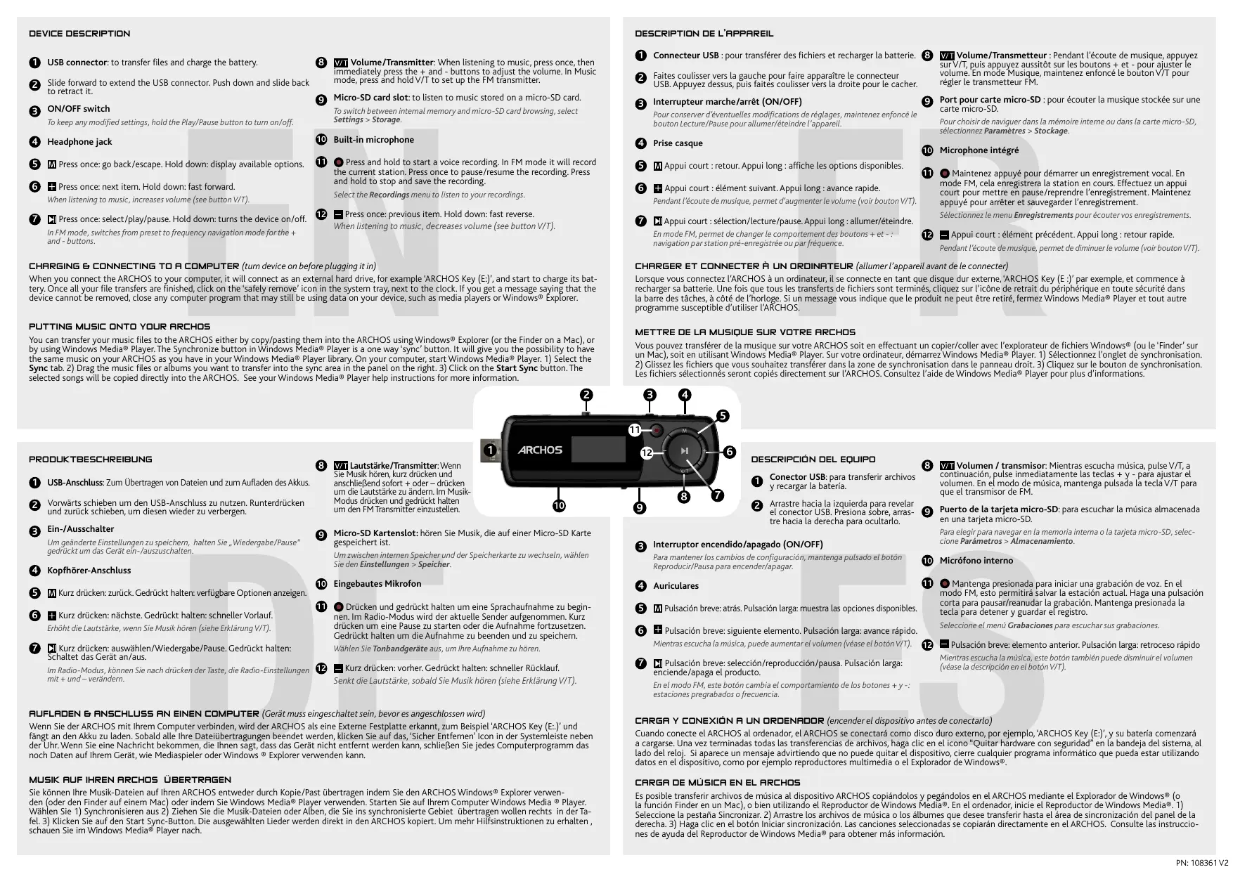 Appui court : élément précédent. Appui long : retour rapide. Pendant l’écoute de musique, permet de diminuer le volume (voir bouton V/T). Charging & connecting to a computer (turn device on before plugging it in) Charger et connecter à un ordinateur (allumer l’appareil avant de le connecter) When you connect the ARCHOS to your computer, it will connect as an external hard drive, for example ‘ARCHOS Key (E:)’, and start to charge its battery. Once all your file transfers are finished, click on the ‘safely remove’ icon in the system tray, next to the clock. If you get a message saying that the device cannot be removed, close any computer program that may still be using data on your device, such as media players or Windows® Explorer. Lorsque vous connectez l’ARCHOS à un ordinateur, il se connecte en tant que disque dur externe, ‘ARCHOS Key (E :)’ par exemple, et commence à recharger sa batterie. Une fois que tous les transferts de fichiers sont terminés, cliquez sur l’icône de retrait du périphérique en toute sécurité dans la barre des tâches, à côté de l’horloge. Si un message vous indique que le produit ne peut être retiré, fermez Windows Media® Player et tout autre programme susceptible d’utiliser l’ARCHOS. Putting Music onto your ARCHOs You can transfer your music files to the ARCHOS either by copy/pasting them into the ARCHOS using Windows® Explorer (or the Finder on a Mac), or by using Windows Media® Player. The Synchronize button in Windows Media® Player is a one way ‘sync’ button. It will give you the possibility to have the same music on your ARCHOS as you have in your Windows Media® Player library. On your computer, start Windows Media® Player. 1) Select the Sync tab. 2) Drag the music files or albums you want to transfer into the sync area in the panel on the right. 3) Click on the Start Sync button. The selected songs will be copied directly into the ARCHOS. See your Windows Media® Player help instructions for more information. Mettre de la musique sur votre ARCHOS Vous pouvez transférer de la musique sur votre ARCHOS soit en effectuant un copier/coller avec l’explorateur de fichiers Windows® (ou le ‘Finder’ sur un Mac), soit en utilisant Windows Media® Player. Sur votre ordinateur, démarrez Windows Media® Player. 1) Sélectionnez l’onglet de synchronisation. 2) Glissez les fichiers que vous souhaitez transférer dans la zone de synchronisation dans le panneau droit. 3) Cliquez sur le bouton de synchronisation. Les fichiers sélectionnés seront copiés directement sur l’ARCHOS. Consultez l’aide de Windows Media® Player pour plus d’informations.