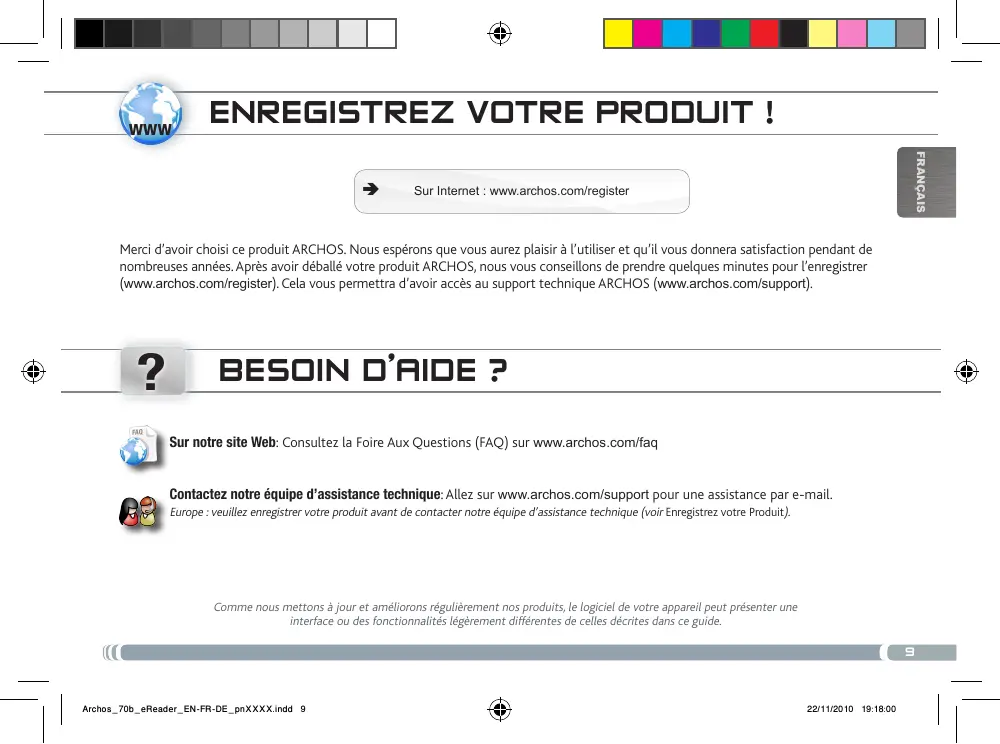 Besoin d’aide ? Sur notre site Web: Consultez la Foire Aux Questions (FAQ) sur www.archos.com/faq Contactez notre équipe d’assistance technique: Allez sur www.archos.com/support pour une assistance par e-mail. Europe : veuillez enregistrer votre produit avant de contacter notre équipe d’assistance technique (voir enregistrez votre Produit). Comme nous mettons à jour et améliorons régulièrement nos produits, le logiciel de votre appareil peut présenter une interface ou des fonctionnalités légèrement différentes de celles décrites dans ce guide.