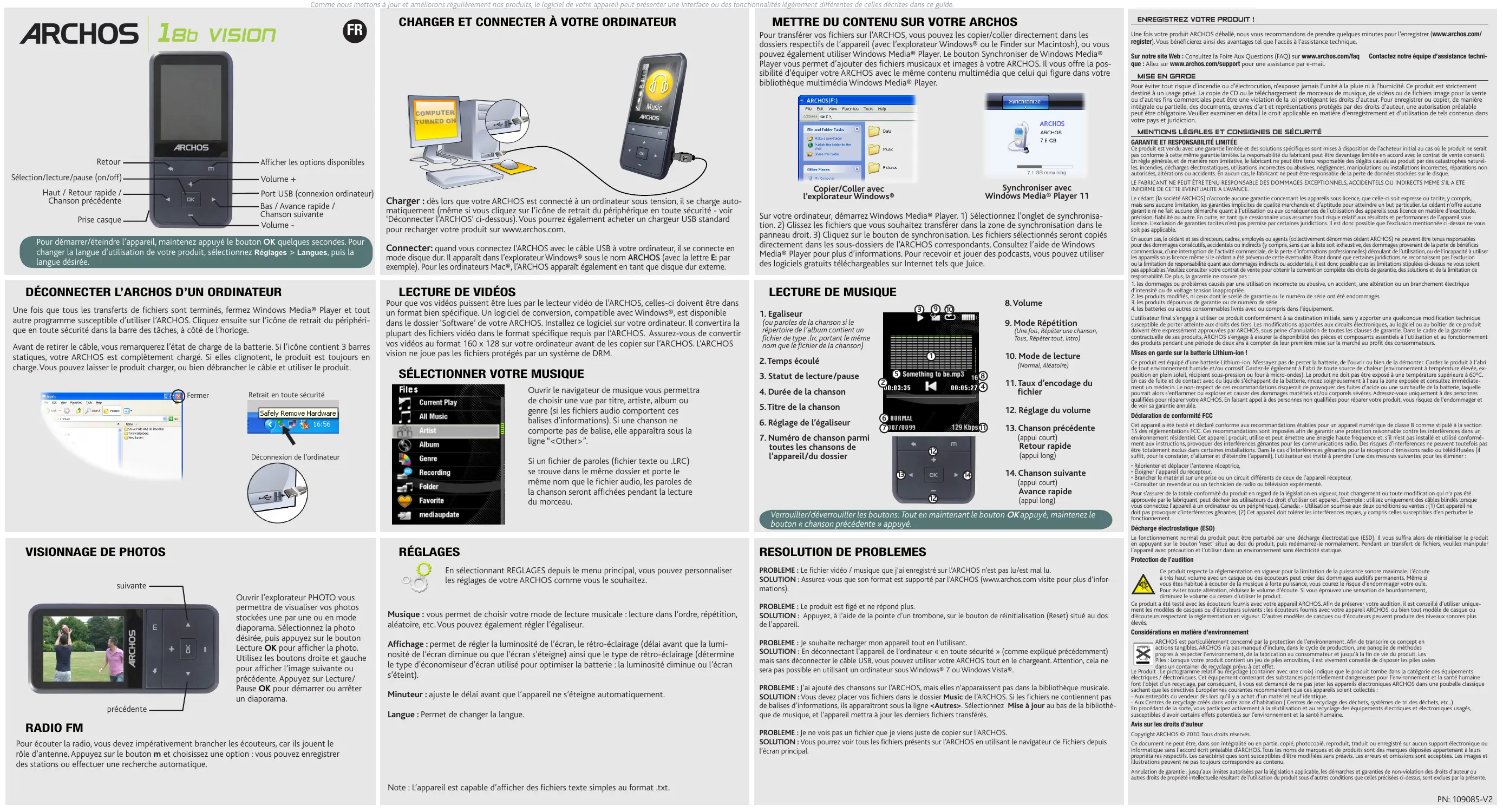 - Consulter un revendeur ou un technicien de radio ou télévision expérimenté. Pour s’assurer de la totale conformité du produit en regard de la législation en vigueur, tout changement ou toute modification qui n’a pas été approuvée par le fabriquant, peut déchoir les utilisateurs du droit d’utiliser cet appareil. (Exemple : utilisez uniquement des câbles blindés lorsque vous connectez l’appareil à un ordinateur ou un périphérique). Canada: - Utilisation soumise aux deux conditions suivantes : (1) Cet appareil ne doit pas provoquer d’interférences gênantes, (2) Cet appareil doit tolérer les interférences reçues, y compris celles susceptibles d’en perturber le fonctionnement. Décharge électrostatique (ESD) Le fonctionnement normal du produit peut être perturbé par une décharge électrostatique (ESD). Il vous suffira alors de réinitialiser le produit en appuyant sur le bouton ‘reset’ situé au dos du produit, puis redémarrez-le normalement. Pendant un transfert de fichiers, veuillez manipuler l’appareil avec précaution et l’utiliser dans un environnement sans électricité statique. Protection de l’audition Ce produit respecte la réglementation en vigueur pour la limitation de la puissance sonore maximale. L’écoute à très haut volume avec un casque ou des écouteurs peut créer des dommages auditifs permanents. Même si vous êtes habitué à écouter de la musique à forte puissance, vous courez le risque d’endommager votre ouïe. Pour éviter toute altération, réduisez le volume d’écoute. Si vous éprouvez une sensation de bourdonnement, diminuez le volume ou cessez d’utiliser le produit. Ce produit a été testé avec les écouteurs fournis avec votre appareil ARCHOS. Afin de préserver votre audition, il est conseillé d’utiliser uniquement les modèles de casques ou d’écouteurs suivants : les écouteurs fournis avec votre appareil ARCHOS, ou bien tout modèle de casque ou d’écouteurs respectant la réglementation en vigueur. D’autres modèles de casques ou d’écouteurs peuvent produire des niveaux sonores plus élevés. Considérations en matière d’environnement ARCHOS est particulièrement concerné par la protection de l’environnement. Afin de transcrire ce concept en actions tangibles, ARCHOS n’a pas manqué d’inclure, dans le cycle de production, une panoplie de méthodes propres à respecter l’environnement, de la fabrication au consommateur et jusqu’à la fin de vie du produit. Les Piles : Lorsque votre produit contient un jeu de piles amovibles, il est vivement conseillé de disposer les piles usées dans un container de recyclage prévu à cet effet. Le Produit : Le pictogramme relatif au recyclage (container avec une croix) indique que le produit tombe dans la catégorie des équipements électriques / électroniques. Cet équipement contenant des substances potentiellement dangereuses pour l’environnement et la santé humaine font l’objet d’un recyclage, par conséquent, il vous est demandé de ne pas jeter les appareils électroniques ARCHOS dans une poubelle classique sachant que les directives Européennes courantes recommandent que ces appareils soient collectés : - Aux entrepôts du vendeur dès lors qu’il y a achat d’un matériel neuf identique. - Aux Centres de recyclage créés dans votre zone d’habitation ( Centres de recyclage des déchets, systèmes de tri des déchets, etc..) En procédant de la sorte, vous participez activement à la réutilisation et au recyclage des équipements électriques et électroniques usagés, susceptibles d’avoir certains effets potentiels sur l’environnement et la santé humaine. Avis sur les droits d’auteur Radio FM PROBLEME : Je ne vois pas un fichier que je viens juste de copier sur l’ARCHOS. SOLUTION : Vous pourrez voir tous les fichiers présents sur l’ARCHOS en utilisant le navigateur de Fichiers depuis l’écran principal. Pour écouter la radio, vous devez impérativement brancher les écouteurs, car ils jouent le rôle d’antenne. Appuyez sur le bouton m et choisissez une option : vous pouvez enregistrer des stations ou effectuer une recherche automatique. Copyright ARCHOS © 2010. Tous droits réservés. Ce document ne peut être, dans son intégralité ou en partie, copié, photocopié, reproduit, traduit ou enregistré sur aucun support électronique ou informatique sans l’accord écrit préalable d’ARCHOS. Tous les noms de marques et de produits sont des marques déposées appartenant à leurs propriétaires respectifs. Les caractéristiques sont susceptibles d’être modifiées sans préavis. Les erreurs et omissions sont acceptées. Les images et illustrations peuvent ne pas toujours correspondre au contenu. Annulation de garantie : jusqu’aux limites autorisées par la législation applicable, les démarches et garanties de non-violation des droits d’auteur ou autres droits de propriété intellectuelle résultant de l’utilisation du produit sous d’autres conditions que celles précisées ci-dessus, sont exclues par la présente. Note : L’appareil est capable d’afficher des fichiers texte simples au format .txt. PN: 108 xxx PN: 109085-V2 Da unsere Produkte kontinuierlich aktualisiert und weiterentwickelt werden, kann die Software Ihres Geräts in Erscheinung und Funktionalität geringfügige Abweichungen zu den Darstellungen in dieser Kurzbedienungsanleitung aufweisen. 18b VISion