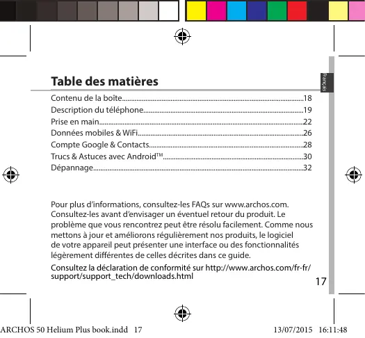 - Dépannage Pour plus d’informations, consultez-les FAQs sur www.archos.com. Consultez-les avant d’envisager un éventuel retour du produit. Le problème que vous rencontrez peut être résolu facilement. Comme nous mettons à jour et améliorons régulièrement nos produits, le logiciel de votre appareil peut présenter une interface ou des fonctionnalités légèrement différentes de celles décrites dans ce guide. Consultez la déclaration de conformité sur http://www.archos.com/fr-fr/ support/support_tech/downloads.html ARCHOS 50 Helium Plus book.indd 17 p. 32
