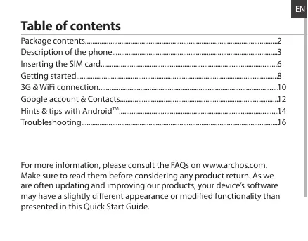 Table des matières Contenu de la boite. 18 Description du téléphone. 19 Insertion de la carte SIM. 2 Mise en route. 24 Connexion 36 & WiFi. 26 Compte Google & Contacts. 28 Trucs & Astuces avec Android" 30 Dépannage. 32 Pour plus d'informations, consultez-les FAQs sur wwwarchos.com. Consultez les avant d'envisager un éventuel retour du produit. Le problème que vous rencontrez peut être résolu facilement. Comme nous mettons à jour et améliorons régulièrement nos produits, le logiciel de votre appareil peut présenter une interface ou des fonctionnalités légèrement différentes de celles décrites dans ce guide.
