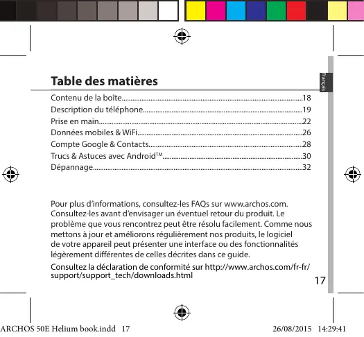Table des matières F | Contenu dela boite 18 Description dutéléphone. 19 Prise en main 2 Données mobiles & WF 35 Compte Google & Contacts. 2 Trucs & Astuces avec Android”! 30 & Dépannage. 32 Pour plus d'informations, consultez-les FAQs sur wwwarchos.com. Consultez les avant d'envisager un éventuel retour du produit. Le problème que vous rencontrez peut être résolu facilement. Comme nous mettons à jour et améliorons régulièrement nos produits, le logiciel de votre appareil peut présenter une interface ou des fonctionnalités légèrement différentes de celles décrites dans ce guide. Consultez la déclaration de conformité sur http://www.archos.com/fr-fr/ support/support_tech/downloadshtmi 17