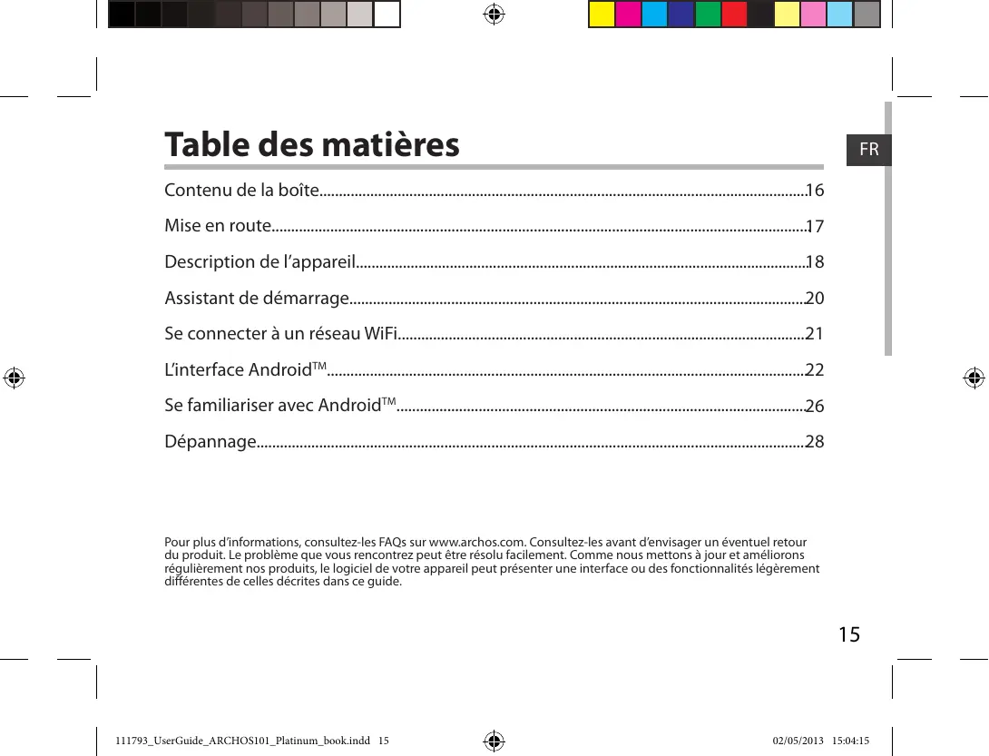 Pour plus d’informations, consultez-les FAQs sur www.archos.com. Consultez-les avant d’envisager un éventuel retour du produit. Le problème que vous rencontrez peut être résolu facilement. Comme nous mettons à jour et améliorons régulièrement nos produits, le logiciel de votre appareil peut présenter une interface ou des fonctionnalités légèrement différentes de celles décrites dans ce guide.