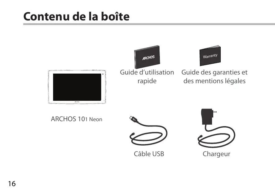 Contenu de la boîte Warran Warran Guide d’utilisation rapide Guide des garanties et des mentions légales Câble USB Chargeur ARCHOS 101 Neon