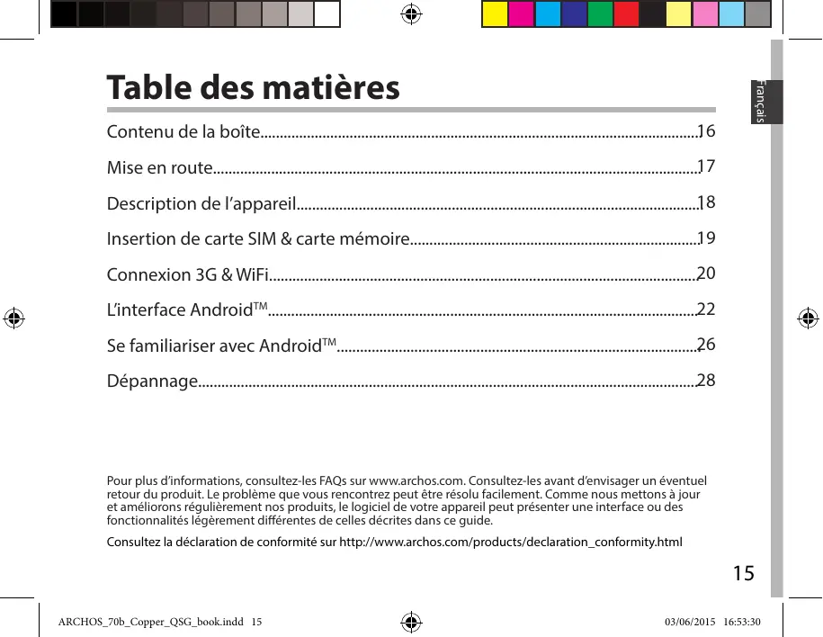 Pour plus d’informations, consultez-les FAQs sur www.archos.com. Consultez-les avant d’envisager un éventuel retour du produit. Le problème que vous rencontrez peut être résolu facilement. Comme nous mettons à jour et améliorons régulièrement nos produits, le logiciel de votre appareil peut présenter une interface ou des fonctionnalités légèrement différentes de celles décrites dans ce guide. Consultez la déclaration de conformité sur http://www.archos.com/products/declaration_conformity.html Contenu de la boîte Warran Warran Guide d’utilisation Guide des garanties et rapide des mentions légales ARCHOS 70b Copper Câble USB Chargeur Charger la batterie