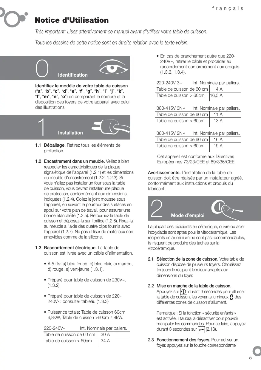(1.3.3, 1.3.4). 220-240V 3~ Int. Nominale par paliers. Table de cuisson de 60 cm 14 A Table de cuisson > 60cm 16,5 A 380-415V 3N~ Int. Nominale par paliers. Table de cuisson de 60 cm 11 A Table de cuisson > 60cm 13 A 380-415V 2N~ Int. Nominale par paliers. Table de cuisson de 60 cm 16 A Table de cuisson > 60cm 19 A Cet appareil est conforme aux Directives Européennes 73/23/CEE et 89/336/CEE. Avertissements: L’installation de la table de cuisson doit être réalisée par un installateur agréé, conformément aux instructions et croquis du fabricant.