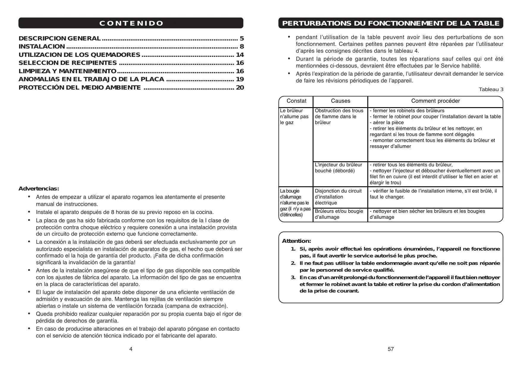 - Après l’expiration de la période de garantie, l’utilisateur devrait demander le service de faire les révisions périodiques de l’appareil. Tableau 3 Constat Le brûleur n’allume pas le gaz Advertencias: