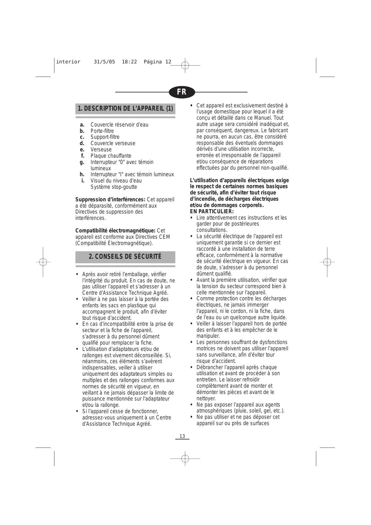 - En cas de panne ou de mauvais fonctionnement de l'appareil, l'éteindre, le débrancher et ne pas tenter de l'arranger. S'il s'avéré nécessaire de le réparer, s'adresser uniquement à un Service d'Assistance Technique agrée par le fabricant et réclamer des pieces de rechange originales.