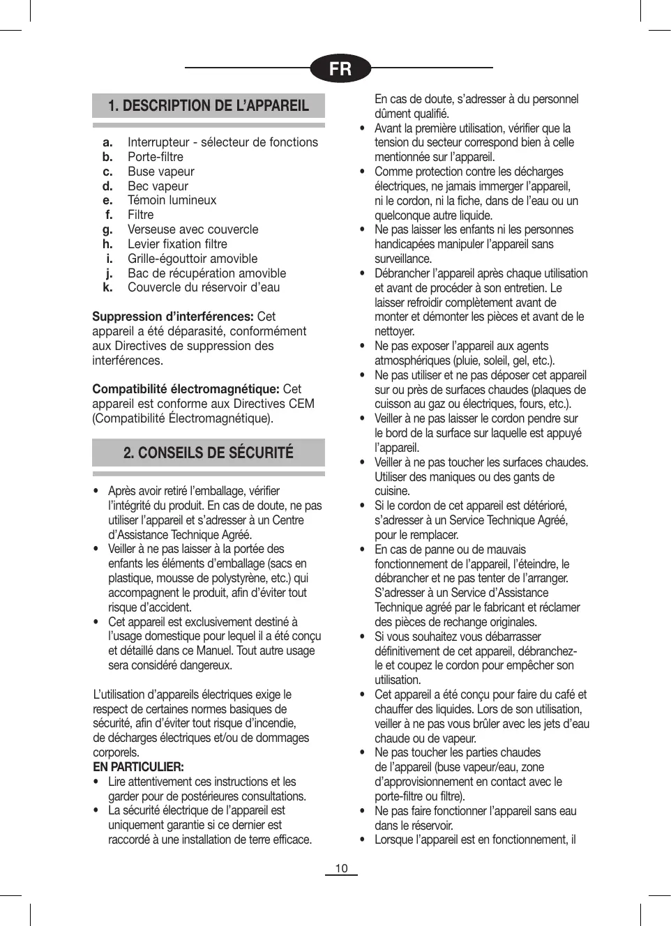 En cas de doute, s’adresser à du personnel dûment qualifié. Avant la première utilisation, vérifier que la tension du secteur correspond bien à celle mentionnée sur l’appareil. Comme protection contre les décharges électriques, ne jamais immerger l’appareil, ni le cordon, ni la fiche, dans de l’eau ou un quelconque autre liquide. Ne pas laisser les enfants ni les personnes handicapées manipuler l’appareil sans surveillance. Débrancher l’appareil après chaque utilisation et avant de procéder à son entretien. Le laisser refroidir complètement avant de monter et démonter les pièces et avant de le nettoyer. Ne pas exposer l’appareil aux agents atmosphériques (pluie, soleil, gel, etc.). Ne pas utiliser et ne pas déposer cet appareil sur ou près de surfaces chaudes (plaques de cuisson au gaz ou électriques, fours, etc.). Veiller à ne pas laisser le cordon pendre sur le bord de la surface sur laquelle est appuyé l’appareil. Veiller à ne pas toucher les surfaces chaudes. Utiliser des maniques ou des gants de cuisine. Si le cordon de cet appareil est détérioré, s’adresser à un Service Technique Agréé, pour le remplacer. En cas de panne ou de mauvais fonctionnement de l’appareil, l’éteindre, le débrancher et ne pas tenter de l’arranger. S’adresser à un Service d’Assistance Technique agréé par le fabricant et réclamer des pièces de rechange originales. Si vous souhaitez vous débarrasser définitivement de cet appareil, débranchezle et coupez le cordon pour empêcher son utilisation. Cet appareil a été conçu pour faire du café et chauffer des liquides. Lors de son utilisation, veiller à ne pas vous brûler avec les jets d’eau chaude ou de vapeur. Ne pas toucher les parties chaudes de l’appareil (buse vapeur/eau, zone d’approvisionnement en contact avec le porte-filtre ou filtre). Ne pas faire fonctionner l’appareil sans eau dans le réservoir. Lorsque l’appareil est en fonctionnement, il