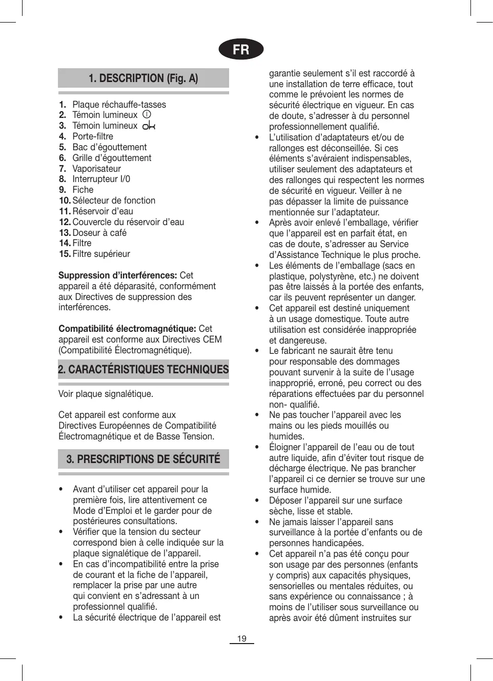 son mode d’emploi par une personne responsable de leur sécurité. Veillez à ne pas laisser les enfants jouer avec l’appareil. Pour une plus grande protection, il est recommandé d’installer un dispositif de courant résiduel (RCD) à courant résiduel opérationnel ne dépassant pas les 30 mA. Consultez votre installateur. Ne pas abandonner l’appareil allumé, car il peut représenter une source de danger. Pour débrancher la fiche, ne jamais tirer sur le cordon. Débrancher l’appareil avant d’effectuer toute opération de nettoyage ou de maintenance. En cas de panne et/ou de mauvais fonctionnement de l’appareil, éteindre ce dernier et ne pas essayer de le réparer. S’il requiert une réparation, s’adresser uniquement à un Service d’Assistance Technique agréé par le fabricant et demander à utiliser des pièces de rechange originales. Si le cordon de l’appareil est endommagé, s’adresser à un Service d’Assistance Technique agréé par le fabricant pour le faire remplacer. Ne pas le laisser cet appareil exposé aux intempéries (pluie, soleil, givre, etc.). Ne pas utiliser l’appareil et ne placer aucune de ses parties sur des surfaces chaudes ou près de celles-ci (plaques de cuisson à gaz ou électriques ou fours). Ne pas utiliser de produits abrasifs pour nettoyer l’appareil. Ne pas toucher les parties chaudes de l’appareil. Saisir toujours l’appareil par la poignée. Éviter que le cordon ne touche les parties chaudes de l’appareil. Ne jamais faire fonctionner la cafetière sans eau dans le réservoir. Ne pas utiliser la vapeur pour réchauffer des liquides inflammables. Le bac d’égouttement et la grille doivent être correctement mis en place avant de mettre la cafetière en marche. Le filtre et le vaporisateur se réchauffent pendant le fonctionnement de