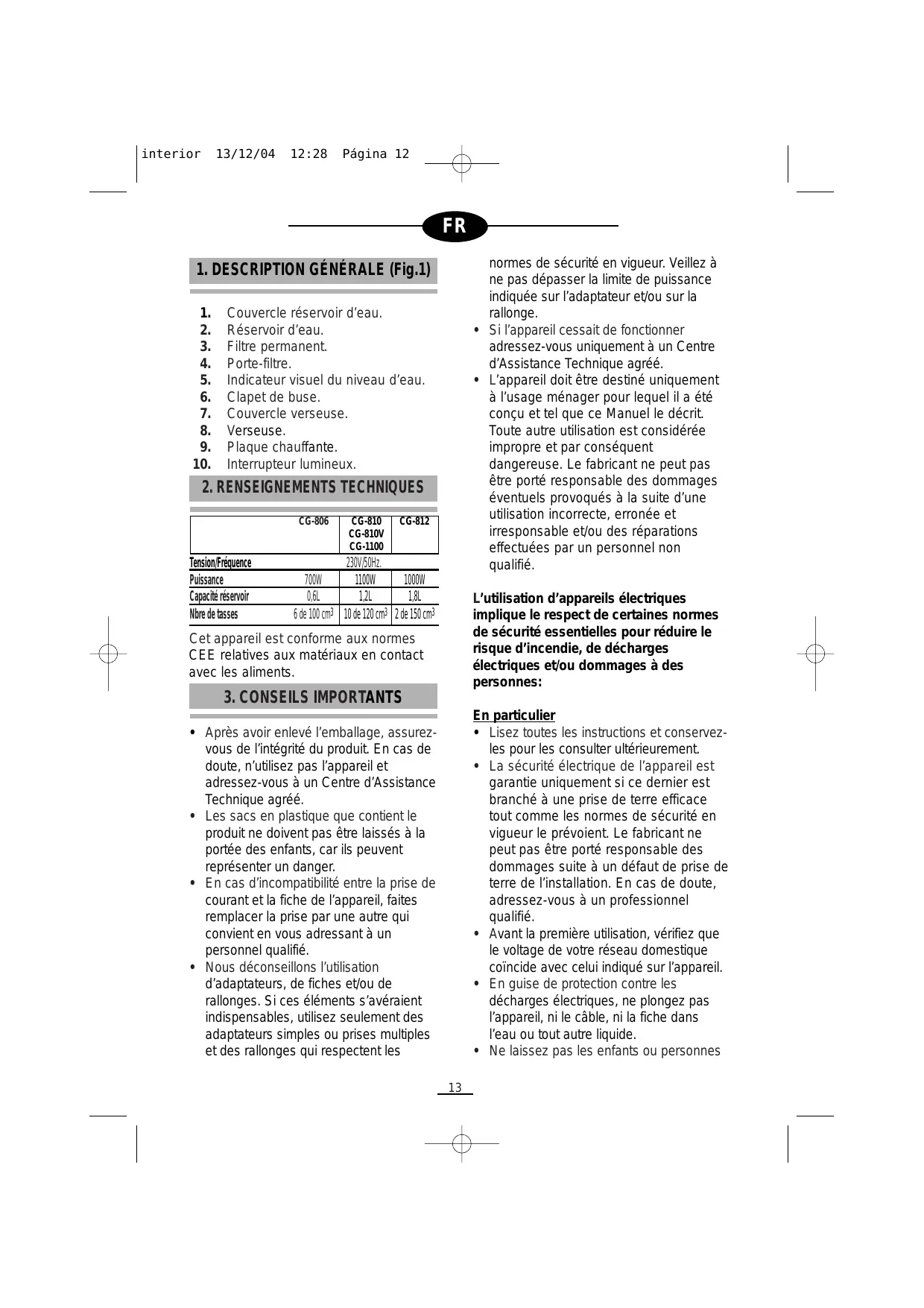 Couvercle réservoir d’eau. Réservoir d’eau. Filtre permanent. Porte-filtre. Indicateur visuel du niveau d’eau. Clapet de buse. Couvercle verseuse. Verseuse. Plaque chauffante. Interrupteur lumineux. Tension/Fréquence Puissance Capacité réservoir Nbre de tasses CG-810 CG-810V CG-1100 CG-812 L’utilisation d’appareils électriques implique le respect de certaines normes de sécurité essentielles pour réduire le risque d’incendie, de décharges électriques et/ou dommages à des personnes: Cet appareil est conforme aux normes CEE relatives aux matériaux en contact avec les aliments.
