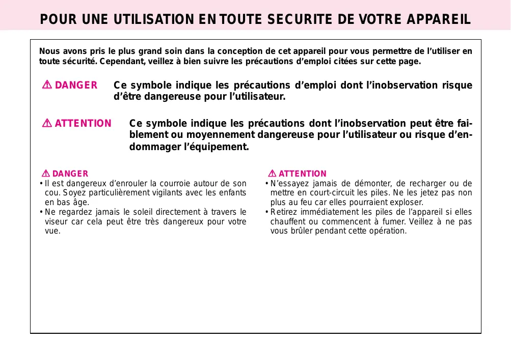 A DANGER • Il est dangereux d’enrouler la courroie autour de son cou. Soyez particulièrement vigilants avec les enfants en bas âge. • Ne regardez jamais le soleil directement à travers le viseur car cela peut être très dangereux pour votre vue.