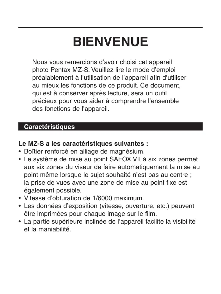 Nous vous remercions d'avoir choisi cet apparéil photo Pentax MZ-S. Veuillez dire le mode d'emploi préalablement à l'utilisation de l' apparéil afin d'utiliser au mieux les fonctions de ce produit. Ce document, qui est à conserver après lecture, sera un outil précieux pour vous aider à comprendre l'ensemble des fonctions de l' apparéil.