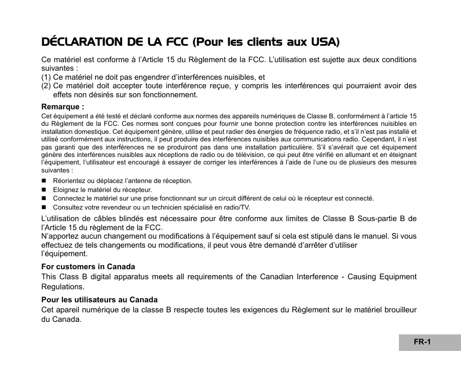 DÉCLARATION DE LA FCC (Pour les clients aux USA) Ce matériel est conforme à l’Article 15 du Règlement de la FCC. L’utilisation est sujette aux deux conditions suivantes : (1) Ce matériel ne doit pas engendrer d’interférences nuisibles, et (2) Ce matériel doit accepter toute interférence reçue, y compris les interférences qui pourraient avoir des effets non désirés sur son fonctionnement. Remarque : Cet équipement a été testé et déclaré conforme aux normes des appareils numériques de Classe B, conformément à l’article 15 du Règlement de la FCC. Ces normes sont conçues pour fournir une bonne protection contre les interférences nuisibles en installation domestique. Cet équipement génère, utilise et peut radier des énergies de fréquence radio, et s’il n’est pas installé et utilisé conformément aux instructions, il peut produire des interférences nuisibles aux communications radio. Cependant, il n’est pas garanti que des interférences ne se produiront pas dans une installation particulière. S’il s’avérait que cet équipement génère des interférences nuisibles aux réceptions de radio ou de télévision, ce qui peut être vérifié en allumant et en éteignant l’équipement, l’utilisateur est encouragé à essayer de corriger les interférences à l’aide de l’une ou de plusieurs des mesures suivantes :