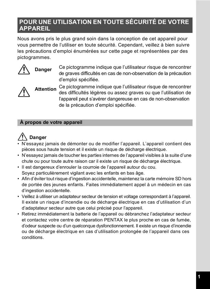 Danger • Il est dangereux d’enrouler la courroie de l’appareil autour du cou. Soyez particulièrement vigilant avec les enfants en bas âge. • Afin d’éviter tout risque d’ingestion accidentelle, maintenez la carte mémoire SD hors de portée des jeunes enfants. Faites immédiatement appel à un médecin en cas d’ingestion accidentelle. • Veillez à utiliser un adaptateur secteur de tension et voltage correspondant à l’appareil. Il existe un risque d’incendie ou de décharge électrique en cas d’utilisation d’un d’adaptateur secteur autre que celui précisé pour l’appareil. • Retirez immédiatement la batterie de l’appareil ou débranchez l’adaptateur secteur et contactez votre centre de réparation PENTAX le plus proche en cas de fumée, d’odeur suspecte ou d’un quelconque dysfonctionnement. Il existe un risque d’incendie ou de décharge électrique en cas d’utilisation prolongée de l’appareil dans ces conditions.