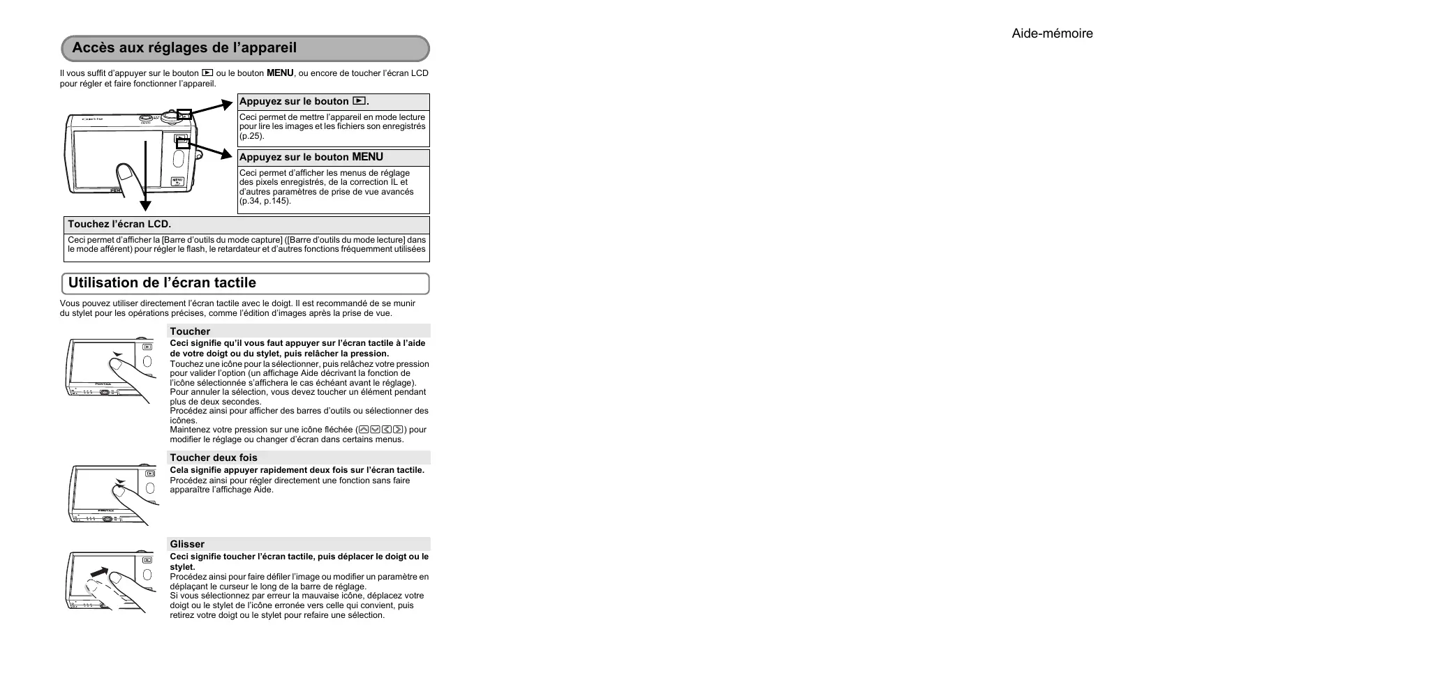 1/250 F2.7 ISO400 26/01/2007 +1.0 14:25 A15 A14 Ceci permet d’afficher la [Barre d’outils du mode capture] ([Barre d’outils du mode lecture] dans le mode afférent) pour régler le flash, le retardateur et d’autres fonctions fréquemment utilisées Utilisation de l’écran tactile Aide-mémoire Indications de l’écran