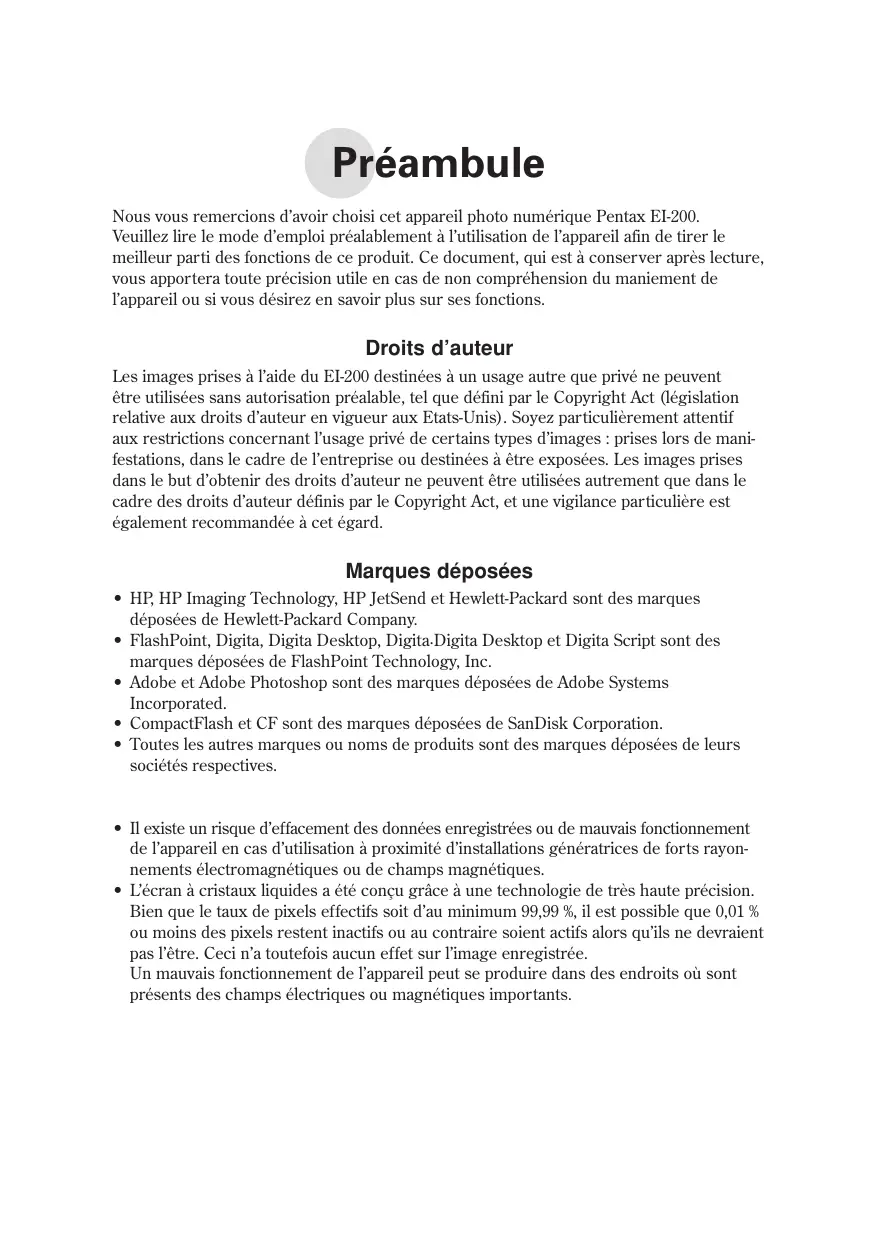 Préambule Nous vous remercions d’avoir choisi cet appareil photo numérique Pentax EI-200. Veuillez lire le mode d’emploi préalablement à l’utilisation de l’appareil afin de tirer le meilleur parti des fonctions de ce produit. Ce document, qui est à conserver après lecture, vous apportera toute précision utile en cas de non compréhension du maniement de l’appareil ou si vous désirez en savoir plus sur ses fonctions. Droits d’auteur Les images prises à l’aide du EI-200 destinées à un usage autre que privé ne peuvent être utilisées sans autorisation préalable, tel que défini par le Copyright Act (législation relative aux droits d’auteur en vigueur aux Etats-Unis). Soyez particulièrement attentif aux restrictions concernant l’usage privé de certains types d’images : prises lors de manifestations, dans le cadre de l’entreprise ou destinées à être exposées. Les images prises dans le but d’obtenir des droits d’auteur ne peuvent être utilisées autrement que dans le cadre des droits d’auteur définis par le Copyright Act, et une vigilance particulière est également recommandée à cet égard. Marques déposées