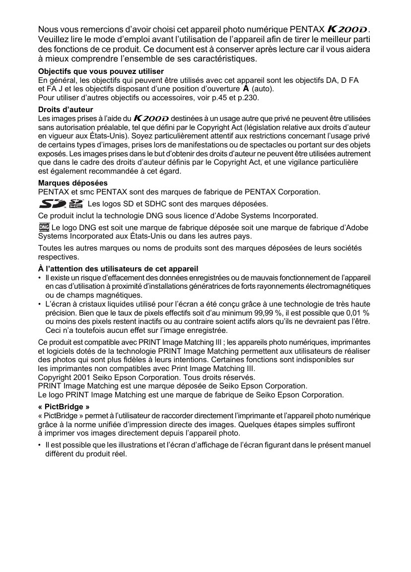 PENTAX Corporation 2-36-9, Maeno-cho, Itabashi-ku, Tokyo 174-8639, JAPAN (http://www.pentax.co.jp/english) PENTAX Europe GmbH (European Headquarters) Julius-Vosseler-Strasse, 104, 22527 Hamburg, GERMANY (HQ - http://www.pentaxeurope.com) (Germany - http://www.pentax.de) Hotline: 0180 5 736829 / 0180 5 PENTAX Austria Hotline: 0820 820 255 (http://www.pentax.at) PENTAX U.K. Limited PENTAX House, Heron Drive, Langley, Slough, Berks SL3 8PN, U.K. (http://www.pentax.co.uk) Hotline: 0870 736 8299 PENTAX France S.A.S. 112 Quai de Bezons - BP 204, 95106 Argenteuil Cedex, FRANCE (http://www.pentax.fr) Hotline: 0826 103 163 (0,15€ la minute) Fax: 01 30 25 75 76 Reflex numérique Mode d’emploi Email: http://www.pentax.fr/_fr/photo/contact.php?photo&contact PENTAX Italia S.r.l. Via Dione Cassio, 15 20138 Milano, ITALY (http://www.pentaxitalia.it) Email : info@pentaxitalia.it PENTAX (Schweiz) AG Widenholzstrasse 1, 8304 Wallisellen, Postfach 367, 8305 Dietlikon, SWITZERLAND (http://www.pentax.ch) PENTAX Imaging Company (Headquarters) 600 12th Street, Suite 300 Golden, Colorado 80401, U.S.A. A Division of PENTAX (PENTAX Service Department) of America, Inc. 12000 Zuni Street, Suite 100B Westminster, Colorado 80234, U.S.A. (http://www.pentaximaging.com) PENTAX Canada Inc. 1770 Argentia Road Mississauga, Ontario L5N 3S7, CANADA (http://www.pentax.ca) PENTAX Trading (SHANGHAI) Limited 23D, Jun Yao International Plaza, 789 Zhaojiabang Road, Xu Hui District, Shanghai, 200032 China (http://www.pentax.com.cn) Mode d’emploi PENTAX Scandinavia AB P.O. Box 650, 75127 Uppsala, SWEDEN (http://www.pentax.se) Le fabricant se réserve le droit de modifier à tout moment les spécifications, le design et le choix des fournisseurs sans notification préalable. AP026602/FRE Copyright © PENTAX Corporation 2008 FOM 01.02.2008 Printed in Europe La lecture du mode d’emploi vous permettra de bénéficier d’un fonctionnement optimal de votre appareil. Nous vous remercions d’avoir choisi cet appareil photo numérique PENTAX x. Veuillez lire le mode d’emploi avant l’utilisation de l’appareil afin de tirer le meilleur parti des fonctions de ce produit. Ce document est à conserver après lecture car il vous aidera à mieux comprendre l’ensemble de ses caractéristiques. Objectifs que vous pouvez utiliser En général, les objectifs qui peuvent être utilisés avec cet appareil sont les objectifs DA, D FA et FA J et les objectifs disposant d’une position d’ouverture s (auto). Pour utiliser d’autres objectifs ou accessoires, voir p.45 et p.230. Droits d’auteur Les images prises à l’aide du x destinées à un usage autre que privé ne peuvent être utilisées sans autorisation préalable, tel que défini par le Copyright Act (législation relative aux droits d’auteur en vigueur aux États-Unis). Soyez particulièrement attentif aux restrictions concernant l’usage privé de certains types d’images, prises lors de manifestations ou de spectacles ou portant sur des objets exposés. Les images prises dans le but d’obtenir des droits d’auteur ne peuvent être utilisées autrement que dans le cadre des droits d’auteur définis par le Copyright Act, et une vigilance particulière est également recommandée à cet égard. Marques déposées PENTAX et smc PENTAX sont des marques de fabrique de PENTAX Corporation. Les logos SD et SDHC sont des marques déposées. Ce produit inclut la technologie DNG sous licence d’Adobe Systems Incorporated. Le logo DNG est soit une marque de fabrique déposée soit une marque de fabrique d’Adobe Systems Incorporated aux États-Unis ou dans les autres pays. Toutes les autres marques ou noms de produits sont des marques déposées de leurs sociétés respectives. À l’attention des utilisateurs de cet appareil