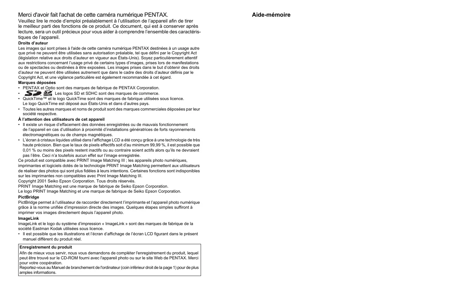 - Il est possible que les illustrations et l’écran d’affichage de l’écran LCD figurant dans le présent manuel diffèrent du produit réel. Enregistrement du produit Afin de mieux vous servir, nous vous demandons de compléter l'enregistrement du produit, lequel peut être trouvé sur le CD-ROM fourni avec l'appareil photo ou sur le site Web de PENTAX. Merci pour votre coopération. Reportez-vous au Manuel de branchement de l'ordinateur (coin inférieur droit de la page 1) pour de plus amples informations. Aide-mémoire