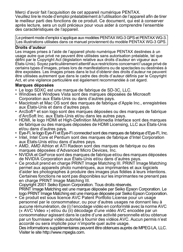 - Le fabricant se réserve le droit de modifier à tout moment les spécifications, le design et le choix des fournisseurs sans notification préalable. OPWG30102/FRE Copyright © PENTAX RICOH IMAGING CO., LTD. 2013 FOM 01.03.2013 Printed in Europe La lecture du mode d’emploi vous permettra de bénéficier d’un fonctionnement optimal de votre appareil. Merci d’avoir fait l’acquisition de cet appareil numérique PENTAX. Veuillez lire le mode d’emploi préalablement à l’utilisation de l’appareil afin de tirer le meilleur parti des fonctions de ce produit. Ce document, qui est à conserver après lecture, sera un outil précieux pour vous aider à comprendre l’ensemble des caractéristiques de l’appareil. Le présent mode d’emploi s’applique aux modèles PENTAX WG-3 GPS et PENTAX WG-3. Les illustrations utilisées dans ce manuel proviennent du modèle PENTAX WG-3 GPS. Droits d’auteur Les images prises à l’aide de l’appareil photo numérique PENTAX destinées à un usage autre que privé ne peuvent être utilisées sans autorisation préalable, tel que défini par le Copyright Act (législation relative aux droits d’auteur en vigueur aux États-Unis). Soyez particulièrement attentif aux restrictions concernant l’usage privé de certains types d’images, prises lors de manifestations ou de spectacles ou destinées à être exposées. Les images prises dans le but d’obtenir des droits d’auteur ne peuvent être utilisées autrement que dans le cadre des droits d’auteur définis par le Copyright Act, et une vigilance particulière est également recommandée à cet égard. Marques déposées