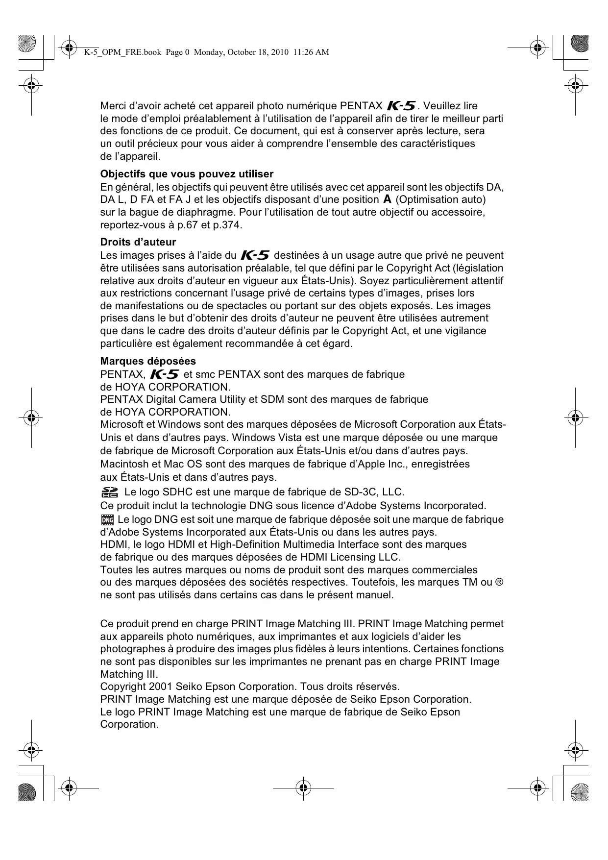 Objectifs que vous pouvez utiliser En général, les objectifs qui peuvent être utilisés avec cet appareil sont les objectifs DA, DA L, D FA et FA J et les objectifs disposant d’une position s (Optimisation auto) sur la bague de diaphragme. Pour l’utilisation de tout autre objectif ou accessoire, reportez-vous à p.67 et p.374. Droits d’auteur Les images prises à l’aide du X destinées à un usage autre que privé ne peuvent être utilisées sans autorisation préalable, tel que défini par le Copyright Act (législation relative aux droits d’auteur en vigueur aux États-Unis). Soyez particulièrement attentif aux restrictions concernant l’usage privé de certains types d’images, prises lors de manifestations ou de spectacles ou portant sur des objets exposés. Les images prises dans le but d’obtenir des droits d’auteur ne peuvent être utilisées autrement que dans le cadre des droits d’auteur définis par le Copyright Act, et une vigilance particulière est également recommandée à cet égard. Marques déposées PENTAX, X et smc PENTAX sont des marques de fabrique de HOYA CORPORATION. PENTAX Digital Camera Utility et SDM sont des marques de fabrique de HOYA CORPORATION. Microsoft et Windows sont des marques déposées de Microsoft Corporation aux ÉtatsUnis et dans d’autres pays. Windows Vista est une marque déposée ou une marque de fabrique de Microsoft Corporation aux États-Unis et/ou dans d’autres pays. Macintosh et Mac OS sont des marques de fabrique d’Apple Inc., enregistrées aux États-Unis et dans d’autres pays. Le logo SDHC est une marque de fabrique de SD-3C, LLC. Ce produit inclut la technologie DNG sous licence d’Adobe Systems Incorporated. Le logo DNG est soit une marque de fabrique déposée soit une marque de fabrique d’Adobe Systems Incorporated aux États-Unis ou dans les autres pays. HDMI, le logo HDMI et High-Definition Multimedia Interface sont des marques de fabrique ou des marques déposées de HDMI Licensing LLC. Toutes les autres marques ou noms de produit sont des marques commerciales ou des marques déposées des sociétés respectives. Toutefois, les marques TM ou ® ne sont pas utilisés dans certains cas dans le présent manuel. Ce produit prend en charge PRINT Image Matching III. PRINT Image Matching permet aux appareils photo numériques, aux imprimantes et aux logiciels d’aider les photographes à produire des images plus fidèles à leurs intentions. Certaines fonctions ne sont pas disponibles sur les imprimantes ne prenant pas en charge PRINT Image Matching III. Copyright 2001 Seiko Epson Corporation. Tous droits réservés. PRINT Image Matching est une marque déposée de Seiko Epson Corporation. Le logo PRINT Image Matching est une marque de fabrique de Seiko Epson Corporation.
