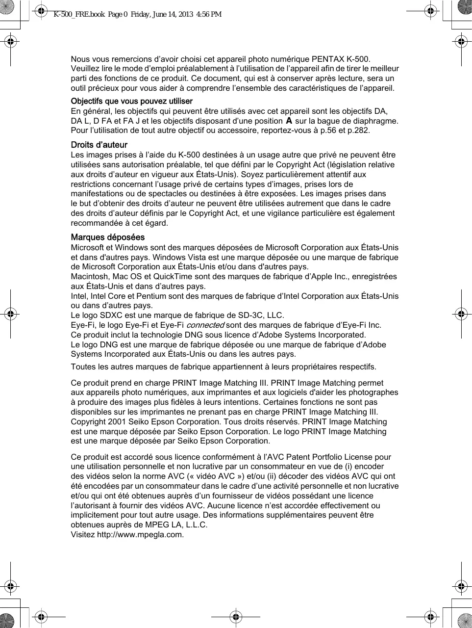 - Les caractéristiques et les dimensions extérieures peuvent être sujettes à modification sans préavis. OPK500302-FR Copyright © PENTAX RICOH IMAGING CO., LTD. 2013 FOM 01.06.2013 Printed in Europe La lecture du mode d’emploi vous permettra de bénéficier d’un fonctionnement optimal de votre appareil. K-500_FRE.book Page 0 Friday, June 14, 2013 4:56 PM Nous vous remercions d’avoir choisi cet appareil photo numérique PENTAX K-500. Veuillez lire le mode d’emploi préalablement à l’utilisation de l’appareil afin de tirer le meilleur parti des fonctions de ce produit. Ce document, qui est à conserver après lecture, sera un outil précieux pour vous aider à comprendre l’ensemble des caractéristiques de l’appareil. Objectifs que vous pouvez utiliser En général, les objectifs qui peuvent être utilisés avec cet appareil sont les objectifs DA, DA L, D FA et FA J et les objectifs disposant d’une position s sur la bague de diaphragme. Pour l’utilisation de tout autre objectif ou accessoire, reportez-vous à p.56 et p.282. Droits d’auteur Les images prises à l’aide du K-500 destinées à un usage autre que privé ne peuvent être utilisées sans autorisation préalable, tel que défini par le Copyright Act (législation relative aux droits d’auteur en vigueur aux États-Unis). Soyez particulièrement attentif aux restrictions concernant l’usage privé de certains types d’images, prises lors de manifestations ou de spectacles ou destinées à être exposées. Les images prises dans le but d’obtenir des droits d’auteur ne peuvent être utilisées autrement que dans le cadre des droits d’auteur définis par le Copyright Act, et une vigilance particulière est également recommandée à cet égard. Marques déposées Microsoft et Windows sont des marques déposées de Microsoft Corporation aux États-Unis et dans d'autres pays. Windows Vista est une marque déposée ou une marque de fabrique de Microsoft Corporation aux États-Unis et/ou dans d'autres pays. Macintosh, Mac OS et QuickTime sont des marques de fabrique d’Apple Inc., enregistrées aux États-Unis et dans d’autres pays. Intel, Intel Core et Pentium sont des marques de fabrique d’Intel Corporation aux États-Unis ou dans d’autres pays. Le logo SDXC est une marque de fabrique de SD-3C, LLC. Eye-Fi, le logo Eye-Fi et Eye-Fi connected sont des marques de fabrique d’Eye-Fi Inc. Ce produit inclut la technologie DNG sous licence d’Adobe Systems Incorporated. Le logo DNG est une marque de fabrique déposée ou une marque de fabrique d’Adobe Systems Incorporated aux États-Unis ou dans les autres pays. Toutes les autres marques de fabrique appartiennent à leurs propriétaires respectifs. Ce produit prend en charge PRINT Image Matching III. PRINT Image Matching permet aux appareils photo numériques, aux imprimantes et aux logiciels d'aider les photographes à produire des images plus fidèles à leurs intentions. Certaines fonctions ne sont pas disponibles sur les imprimantes ne prenant pas en charge PRINT Image Matching III. Copyright 2001 Seiko Epson Corporation. Tous droits réservés. PRINT Image Matching est une marque déposée par Seiko Epson Corporation. Le logo PRINT Image Matching est une marque déposée par Seiko Epson Corporation. Ce produit est accordé sous licence conformément à l’AVC Patent Portfolio License pour une utilisation personnelle et non lucrative par un consommateur en vue de (i) encoder des vidéos selon la norme AVC (« vidéo AVC ») et/ou (ii) décoder des vidéos AVC qui ont été encodées par un consommateur dans le cadre d’une activité personnelle et non lucrative et/ou qui ont été obtenues auprès d’un fournisseur de vidéos possédant une licence l’autorisant à fournir des vidéos AVC. Aucune licence n’est accordée effectivement ou implicitement pour tout autre usage. Des informations supplémentaires peuvent être obtenues auprès de MPEG LA, L.L.C. Visitez http://www.mpegla.com. K-500_FRE.book Page 1 Friday, June 14, 2013 4:56 PM À l’attention des utilisateurs de cet appareil