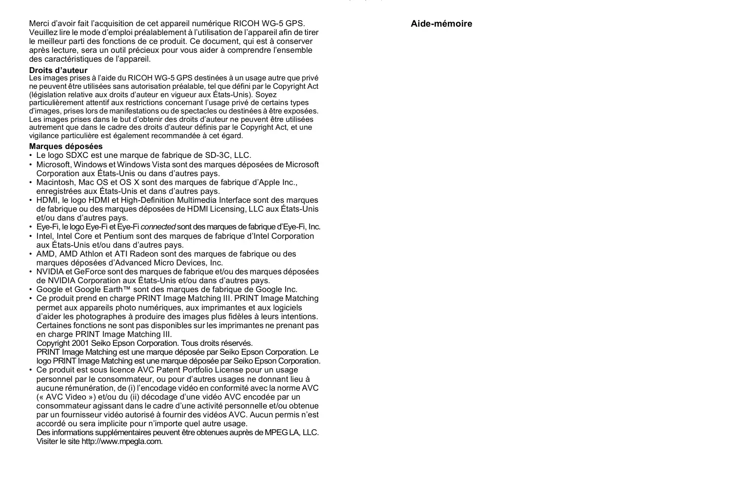 Les images prises à l’aide du RICOH WG-5 GPS destinées à un usage autre que privé ne peuvent être utilisées sans autorisation préalable, tel que défini par le Copyright Act (législation relative aux droits d’auteur en vigueur aux États-Unis). Soyez particulièrement attentif aux restrictions concernant l’usage privé de certains types d’images, prises lors de manifestations ou de spectacles ou destinées à être exposées. Les images prises dans le but d’obtenir des droits d’auteur ne peuvent être utilisées autrement que dans le cadre des droits d’auteur définis par le Copyright Act, et une vigilance particulière est également recommandée à cet égard.