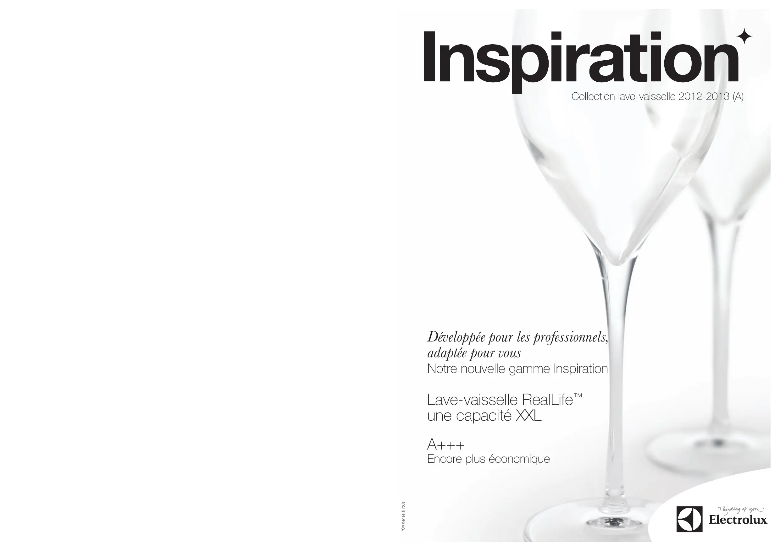 Collection lave-vaisselle 2012-2013 (A) Développée pour les professionnels, adaptée pour vous Notre nouvelle gamme Inspiration Lave-vaisselle RealLife™ une capacité XXL A+++ *On pense à vous Encore plus économique À propos d’Electrolux Des marques et des produits conçus pour leurs utilisateurs pour l'in its novatio