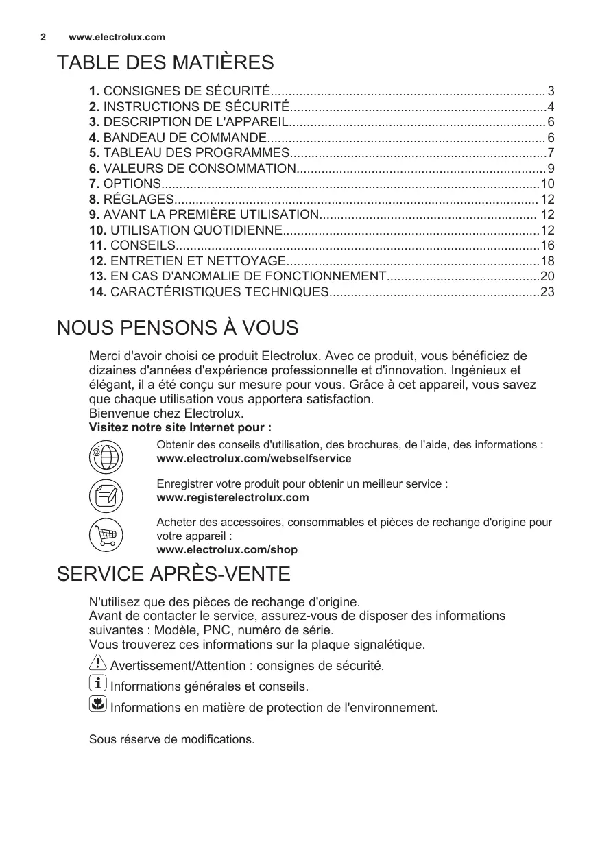 4. BANDEAU DE COMMANDE 6 5. TABLEAU DES PROGRAMMES7 6. VALEURS DE CONSOMMATION9 7. OPTIONS10 8. RÉGLAGES 12 9. AVANT LA PREMIÈRE UTILISATION 12 élégant, il a été conçu sur mesure pour vous. Grâce à cet appareil, vous savez que chaque utilisation vous apportera satisfaction. Bienvenue chez Electrolux. Visitez notre site Internet pour :